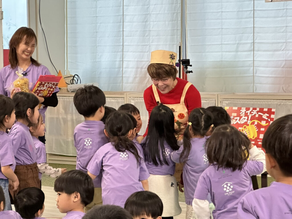 読み聞かせの中では、パスタをテーマにしたやりとりがあり、形や名前について考えたり、「何に見えるかな?」と想像をふくらませたりする場面が見られました。