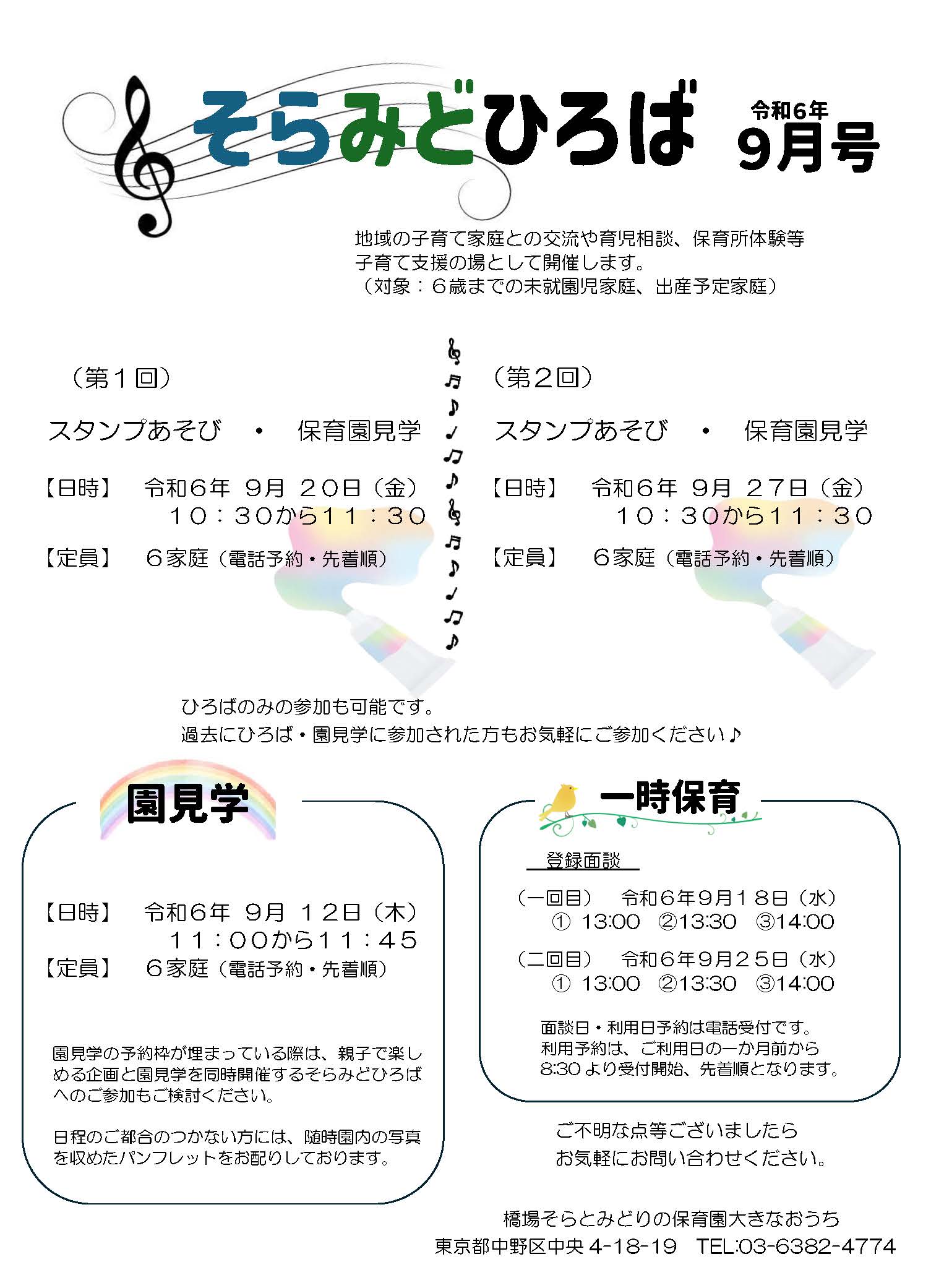 橋場そらとみどりの保育園大きなおうち 【子育て支援】9月の園見学・一時保育開催日のお知らせ | 東京児童協会