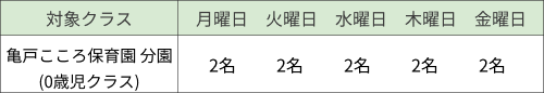 ※ 0歳児クラス:令和5年(2023年)4月2日以降生まれ(ただし、利用開始時に生後6ヵ月以上であること)