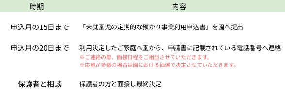※ 翌月の通常保育の入所調整の結果、認可定員に達した場合は、お預かりすることができません。