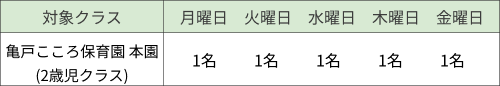 - 江東区内に住所のある、保育所等に通っていない又は在籍していない、0歳児~2歳児クラスの集団生活が可能な児童