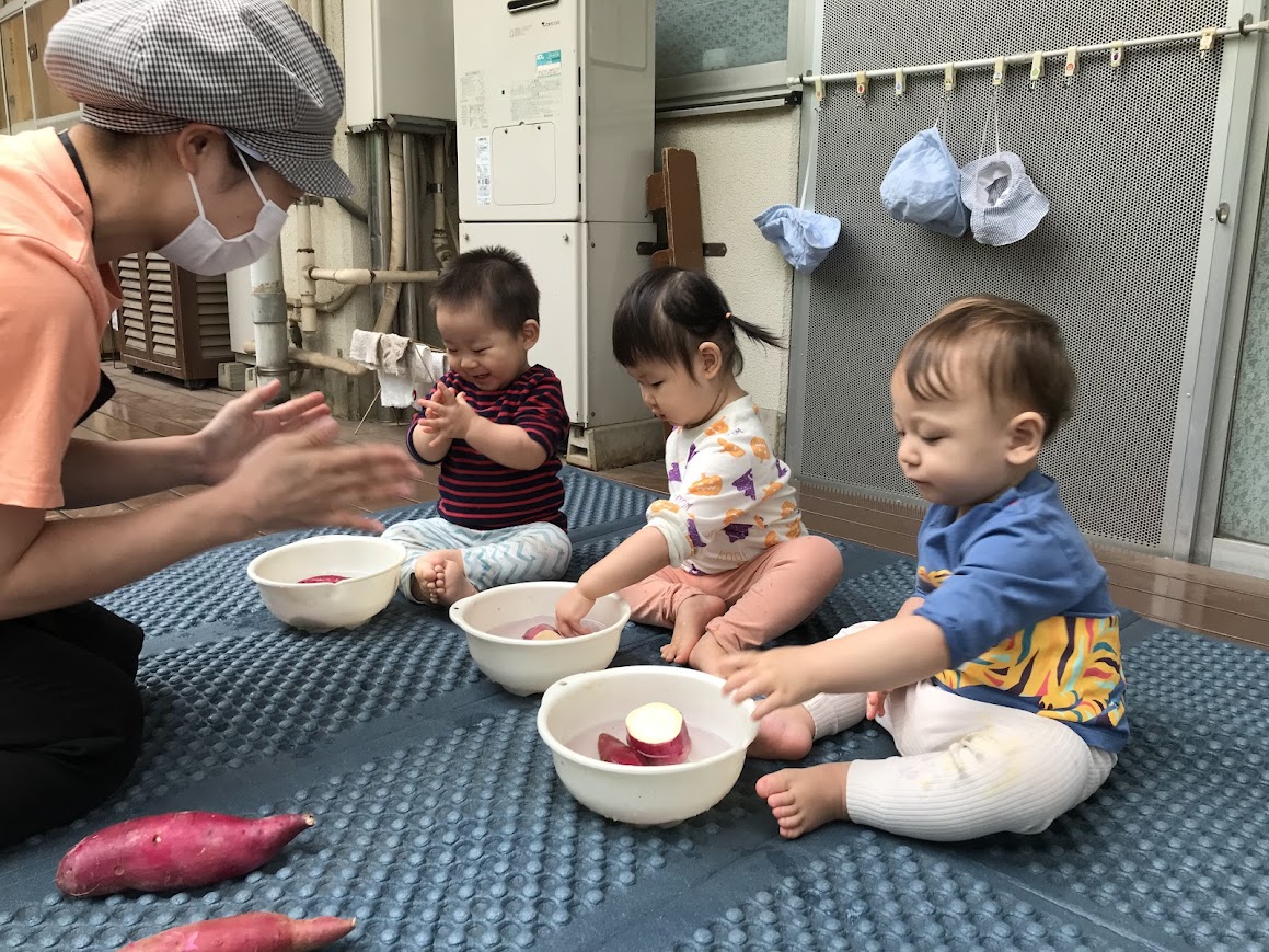乳児クラスでさつまいも洗いをしました。さつま芋を両手に持ち、叩いてみたり皮や断面の感触、色合いを楽しむ様子がありました。子どもたちが洗ったさつま芋はおやつに大学芋にして提供しました。