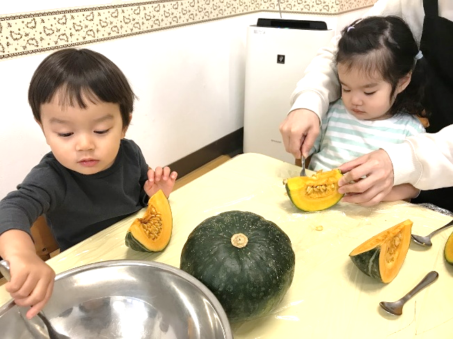乳児クラスで南瓜の種取りをしました。南瓜を実際に両手で持ってみて皮の感触や重さに驚いたり、種を一生懸命に取る姿がありました。南瓜プリンとしておやつに提供した際には、 嬉しそうに食べていました。