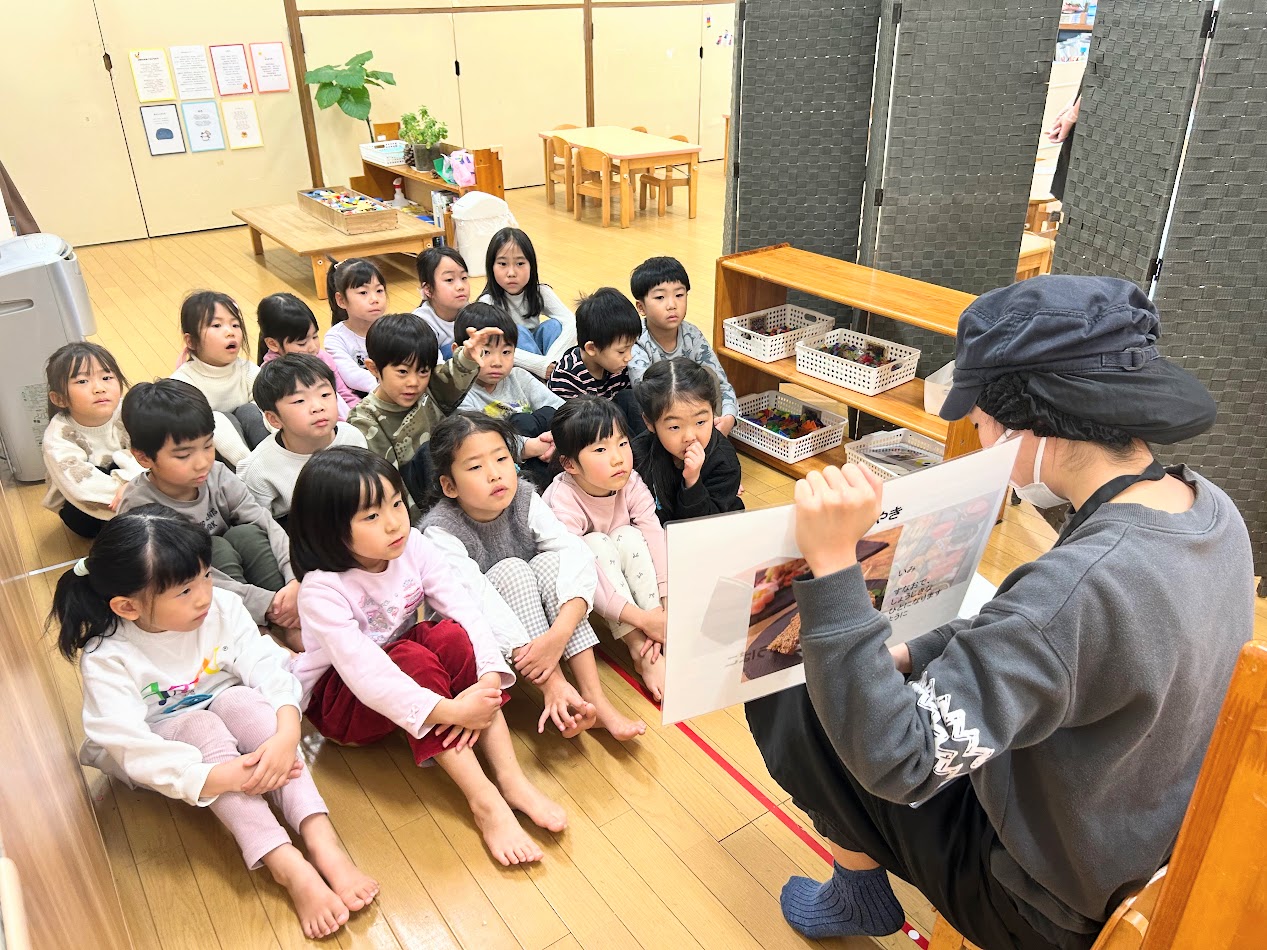 幼児クラスでおせちの話をしました。お正月のことを思い出して「おせちたべたよ」 「くりきんとんすき!」等と話していました。また、一つ一つの料理に込められた意味を理解して食べる姿がありました。