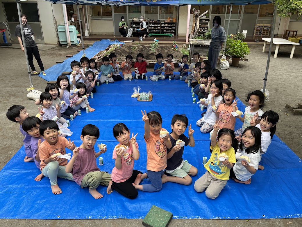 園庭にブルーシートを敷き、皆で円になっておやつを食べました。メロンパンとヨーグルトドリンクが配られると「やった~!メロンパンだ!」と大興奮の子どもたち。皆で「いただきます」と元気一杯に挨拶をして食べ始めると「そとでたべるメロンパン、すごくおいしい!」「ヨーグルトドリンクもおいしいよ!」「きょうあめふらなくて、よかったね!」と友だち同士で様々な思いを伝え合いながら食べていました。「つぎは、おひるごはんもえんていでたべたいな!」と次回の開催を楽しみにする子どもたちでした。
