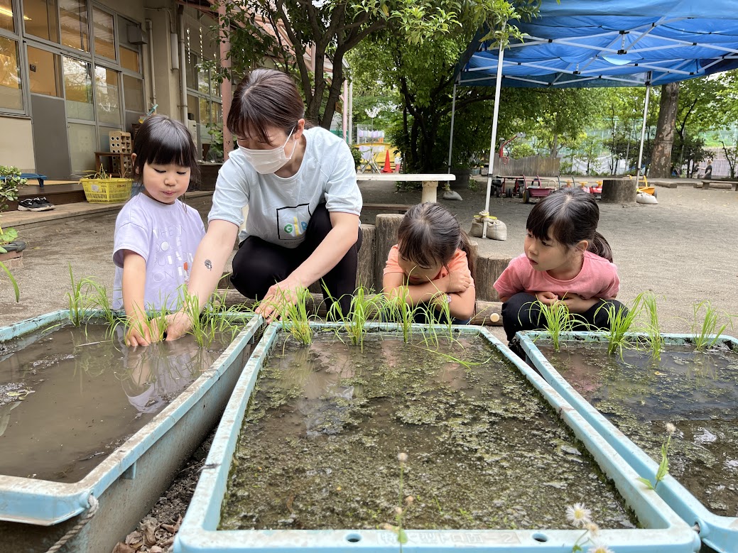 つき組の皆でかもめファームに夏野菜と稲の苗を植えました。今年度の夏野菜はキュウリ、ナス、パプリカ、オクラの4種類を育てます。「はやくなえうえしたい!」「やさいいっぱいしゅうかくしたいな!」と張り切っていた子どもたち。栄養士から苗の植え方を教わり「おおきくな~れ、おいしくな~れ!」と皆で唱えながら丁寧に植えていきました。園庭に出ると真っ先にかもめファームの様子を見に行き「みて、ちょっとおおきくなってるよ!」「ほんとうだ!おはなもさいてる!」等と気付いたことや感じたことを伝え合う姿がたくさん見られました。また「はやくキュウリたべたいな…!」「ナスはおみそしるにいれてたべたい!」と収穫に向けて期待を膨らませています。今後も夏野菜や稲の世話を通して、食べ物を育てることの大変さや楽しさ等を感じられるようにしていきたいと思います。