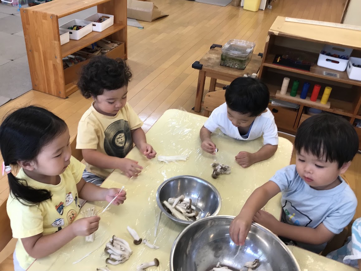 乳児クラスで秋が旬のきのこさきをしました。きのこの匂いを嗅いでみたり、さいたり、ちぎったり食材に親しみ、楽しんでいました。昼食の味噌汁に入れる様子を見守って、みんなで食べました。