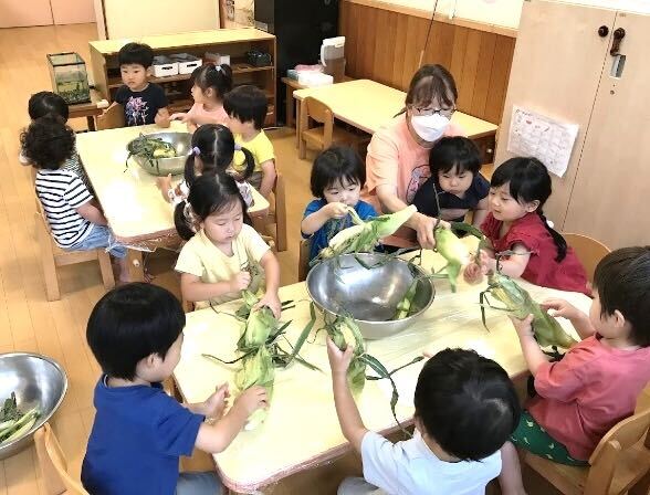 乳児クラスでとうもろこしの皮むきをしました。「皮むき楽しい」と楽しんでおり、おやつに焼きとうもろこしとして食べました。