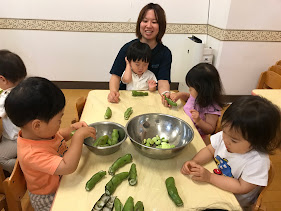 とうもろこしは保育園の献立でも人気の食材です。まるごとのとうもろこしを1本皮をむいて、調理し(蒸す、ゆでるなど)すぐに食べられるのは夏ならではです。保育園でも子どもたちと一緒に皮むきをしています。とうもろこしの皮むきを通して、皮やひげの感触を感じることができます。スーパーや八百屋では髭が多くて黒い物の選んでみてください。きっと甘いはずです!ご家庭でもぜひとうもろこしの皮むきをして、料理に取り入れてみてはいかがでしょうか。