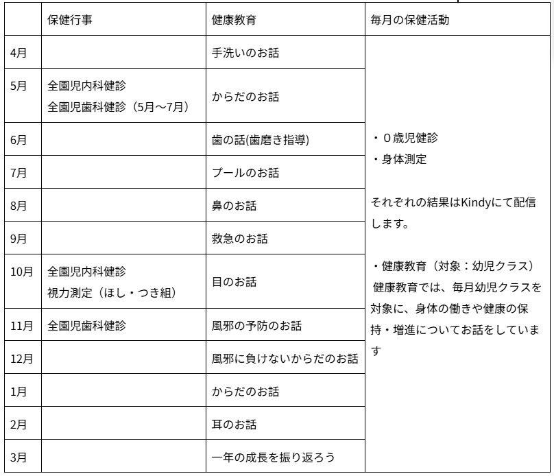 年間の保健行事予定です。具体的な日程などにつきましては、都度お知らせいたします。