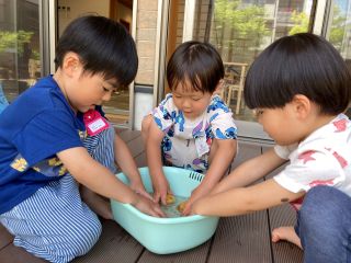 水を張ったバケツを見て「これは何に使うの?」と興味津々の様子です。昨今取り沙汰されているおコメ問題もありますが、葛西産のお米は果たして元気に育つでしょうか。ぜひ保育参加された際や7月の夏祭りの際などに子どもたちと一緒に観察してみてください。