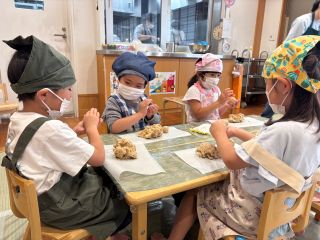 5月は、幼児クラスで夏野菜の苗植え、新じゃが芋洗い、春キャベツちぎりを行いました。旬の野菜に触れる機会を多く設けたことで、図鑑やランチルームに設置してある3色ボードに興味を示す姿が増えています。今後も食材に触れる機会たくさん作っていきたいと思います。また、つき組さんと行った味噌作りでは、毎年作ることを心待ちにしてくれている様子があり、大豆から味噌や他の食材に変身するお話を驚きながら真剣に聞く姿がありました。完成が楽しみです。