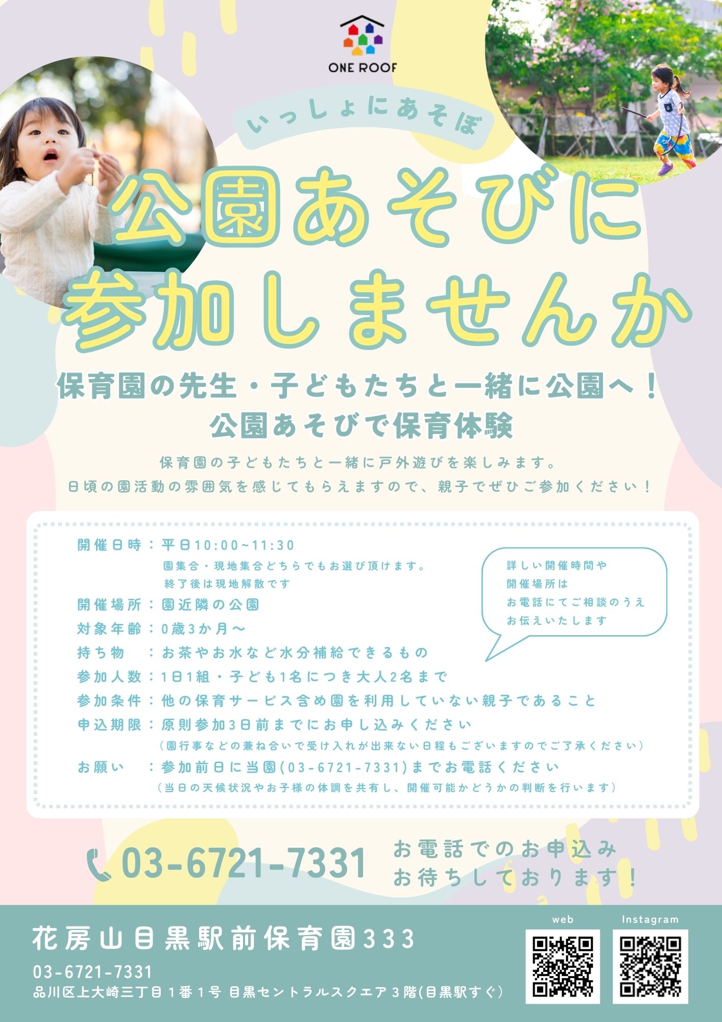 | お願い | 参加前日に当園(03-6721-7331)までお電話ください ※当日の天候状況やお子様の体調を共有し、開催可能かどうかの判断を行います |