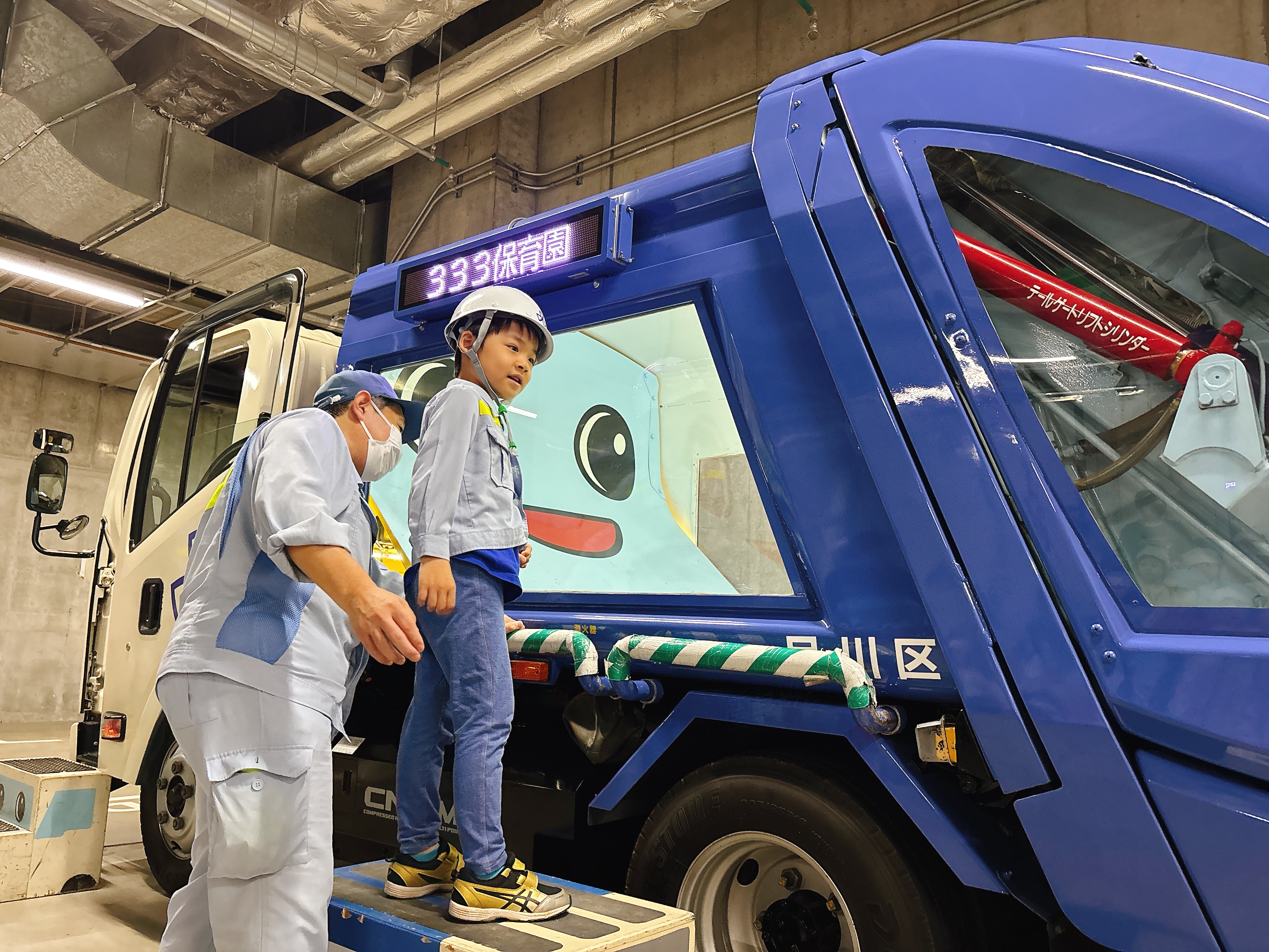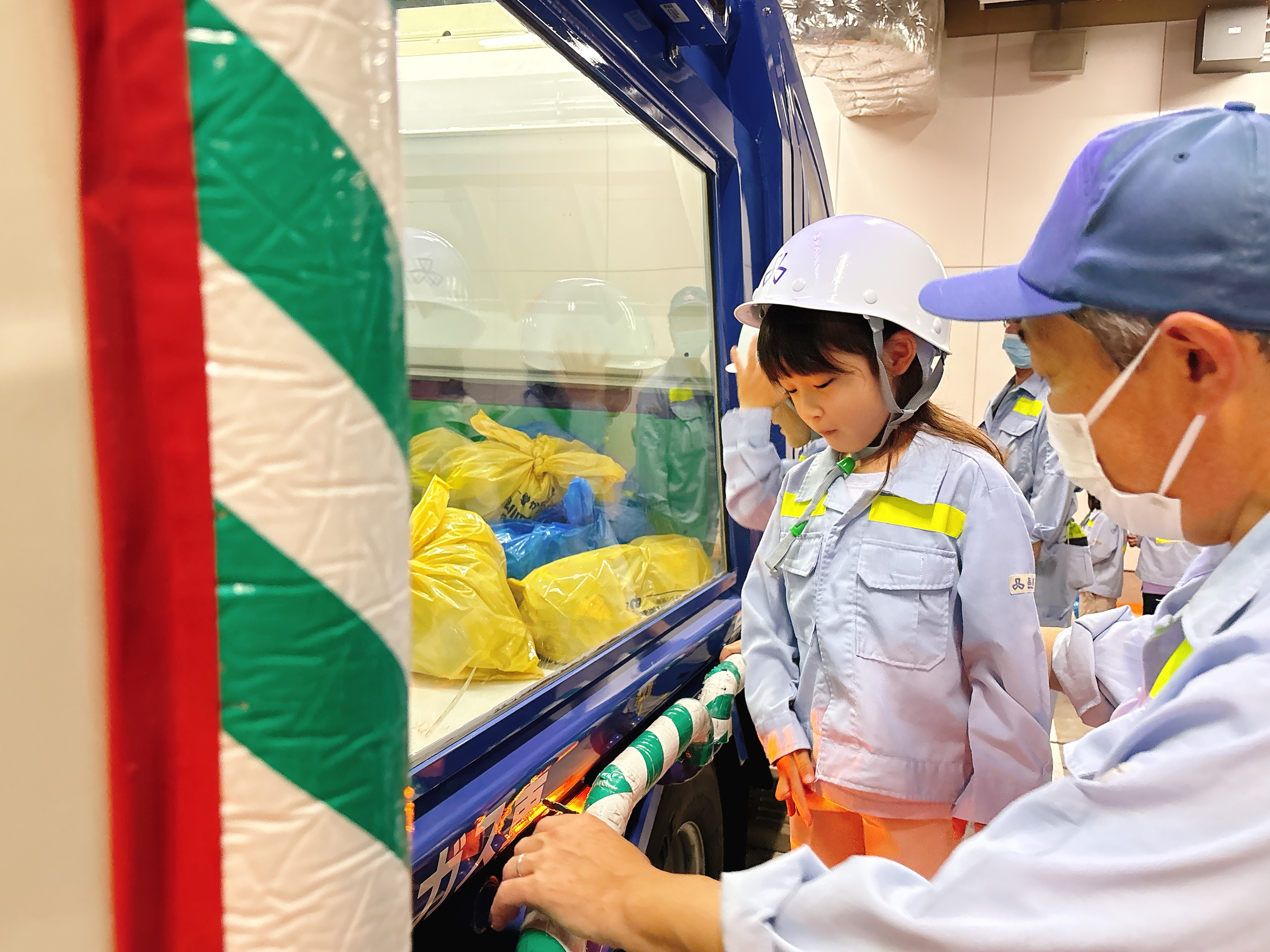 イベントの最後には、みんなでおそろいの清掃局のユニフォームを着て、スケルトンのごみ収集車を実際に操作!車のしくみを楽しく学びながら、ごみを集めるお仕事の大変さや大切さも、肌で感じることができました。