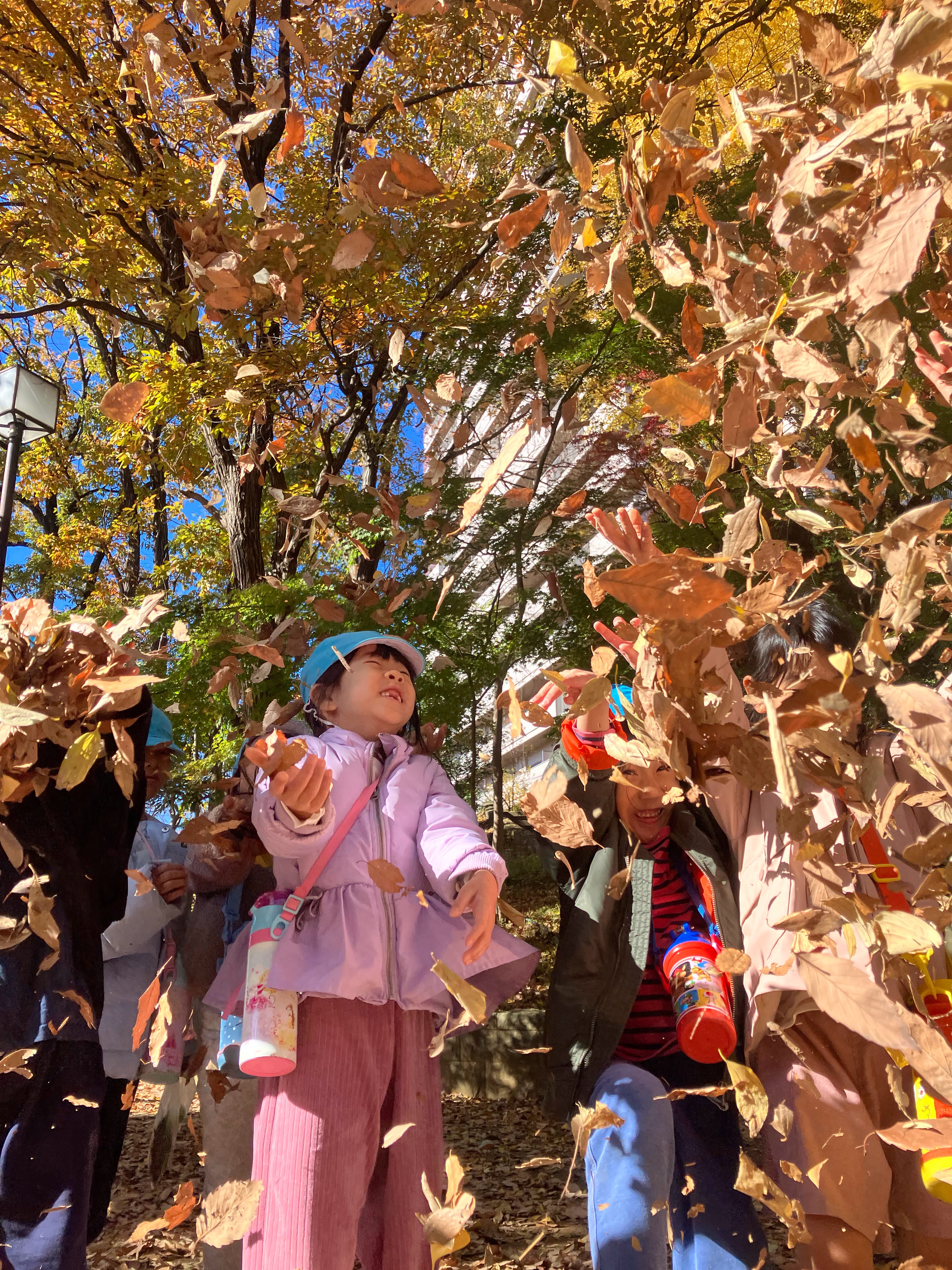 先日は三田丘の上公園に散歩に出かけ、落ち葉シャワーやドングリ拾いを楽しんできました。