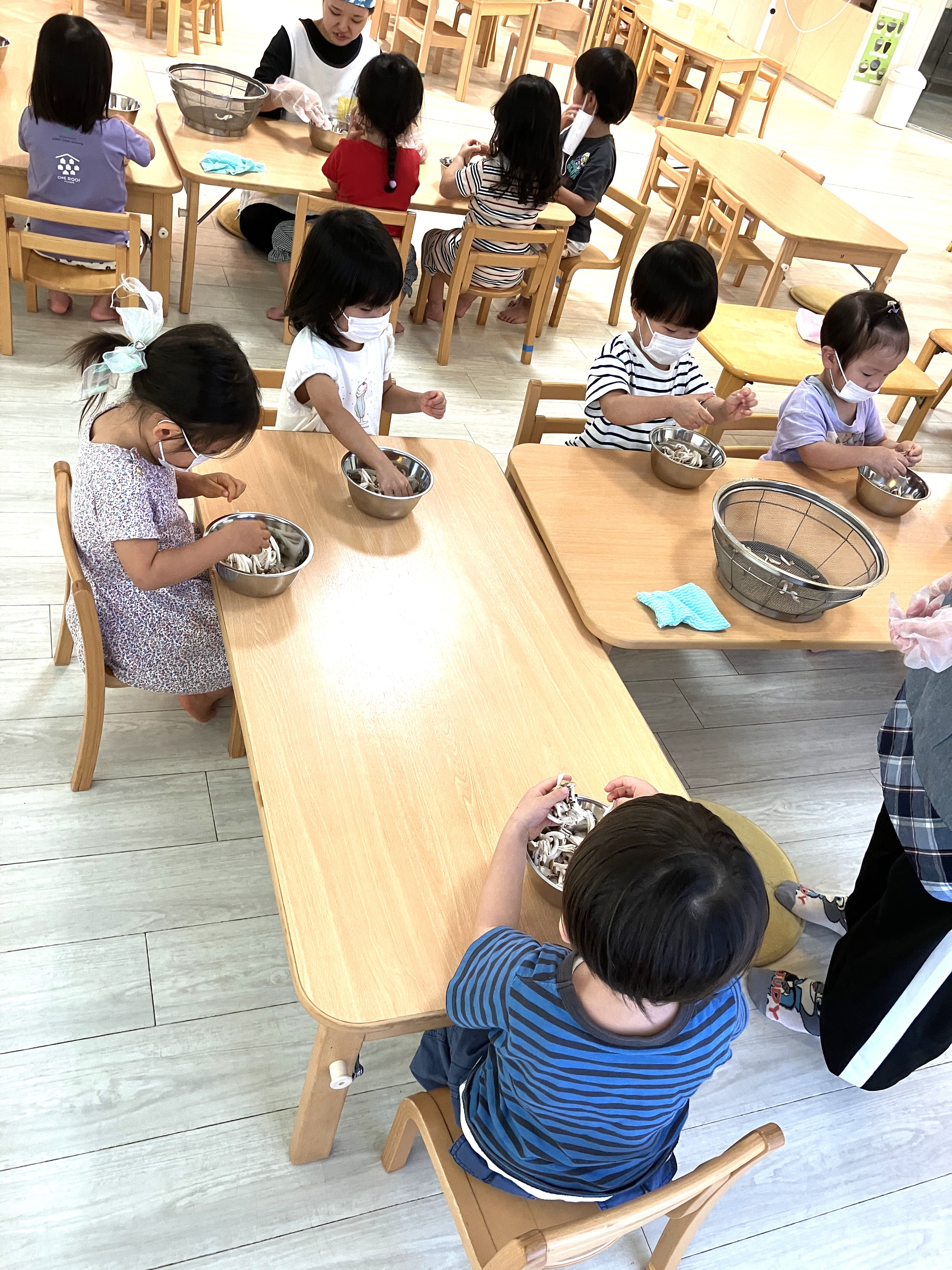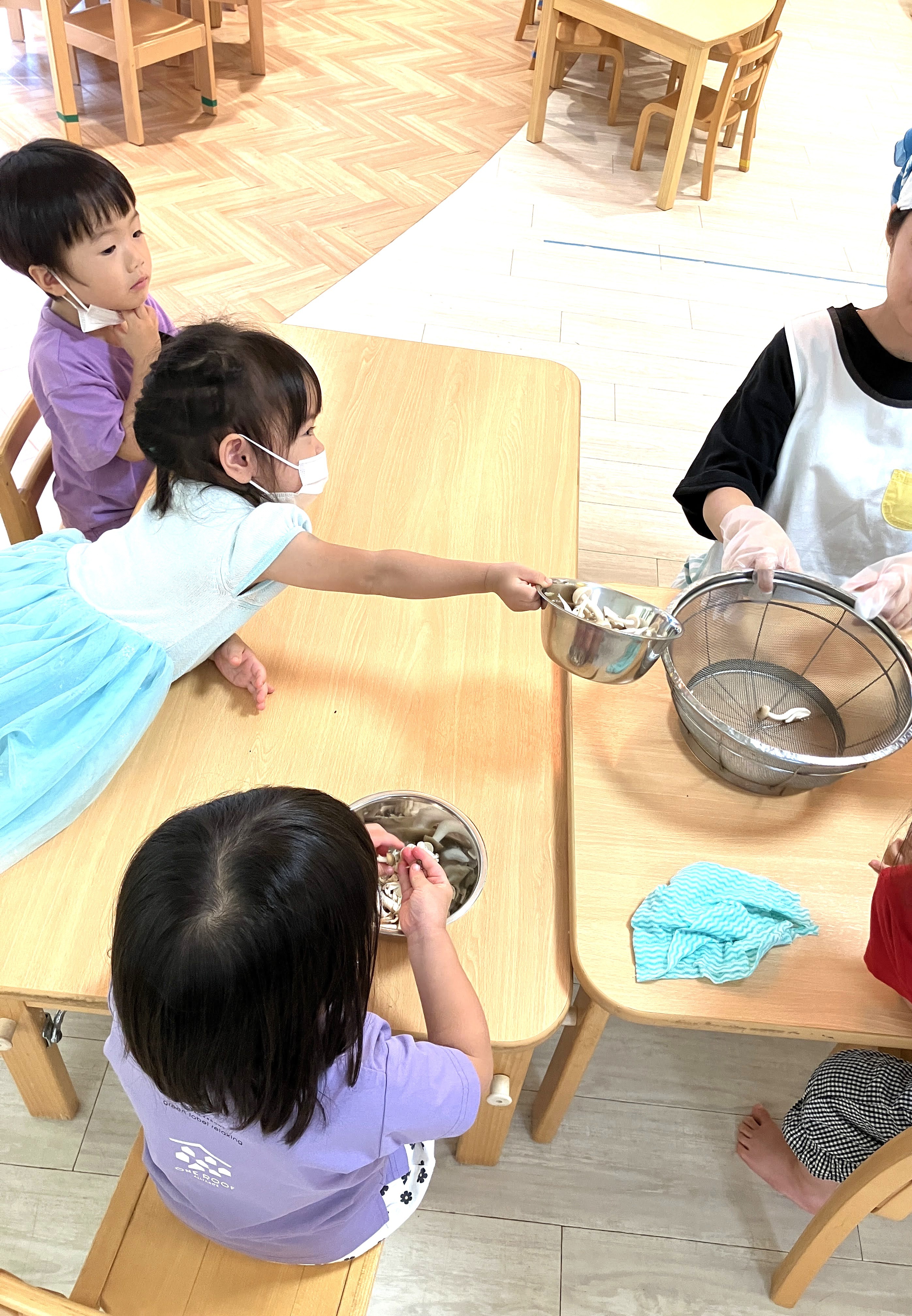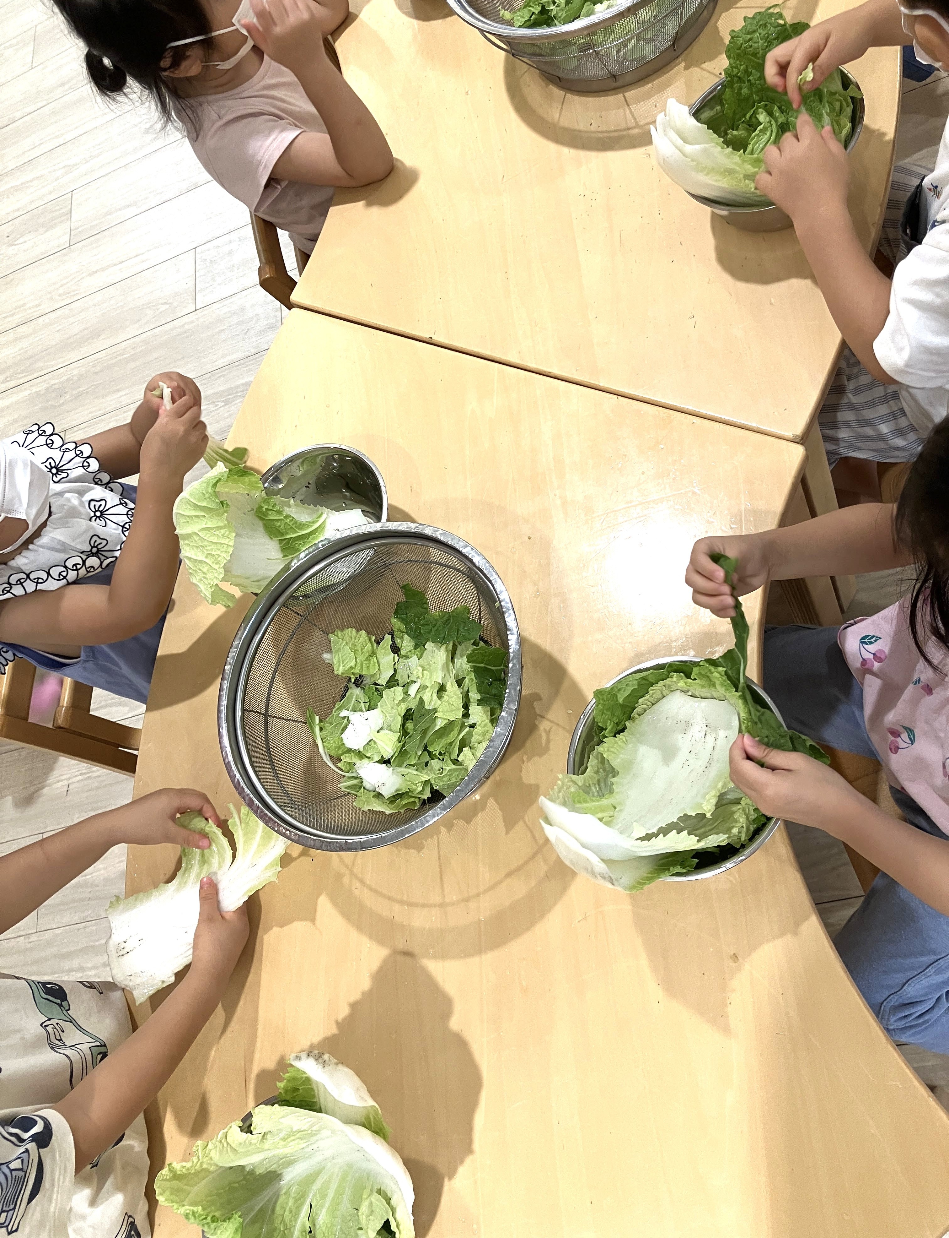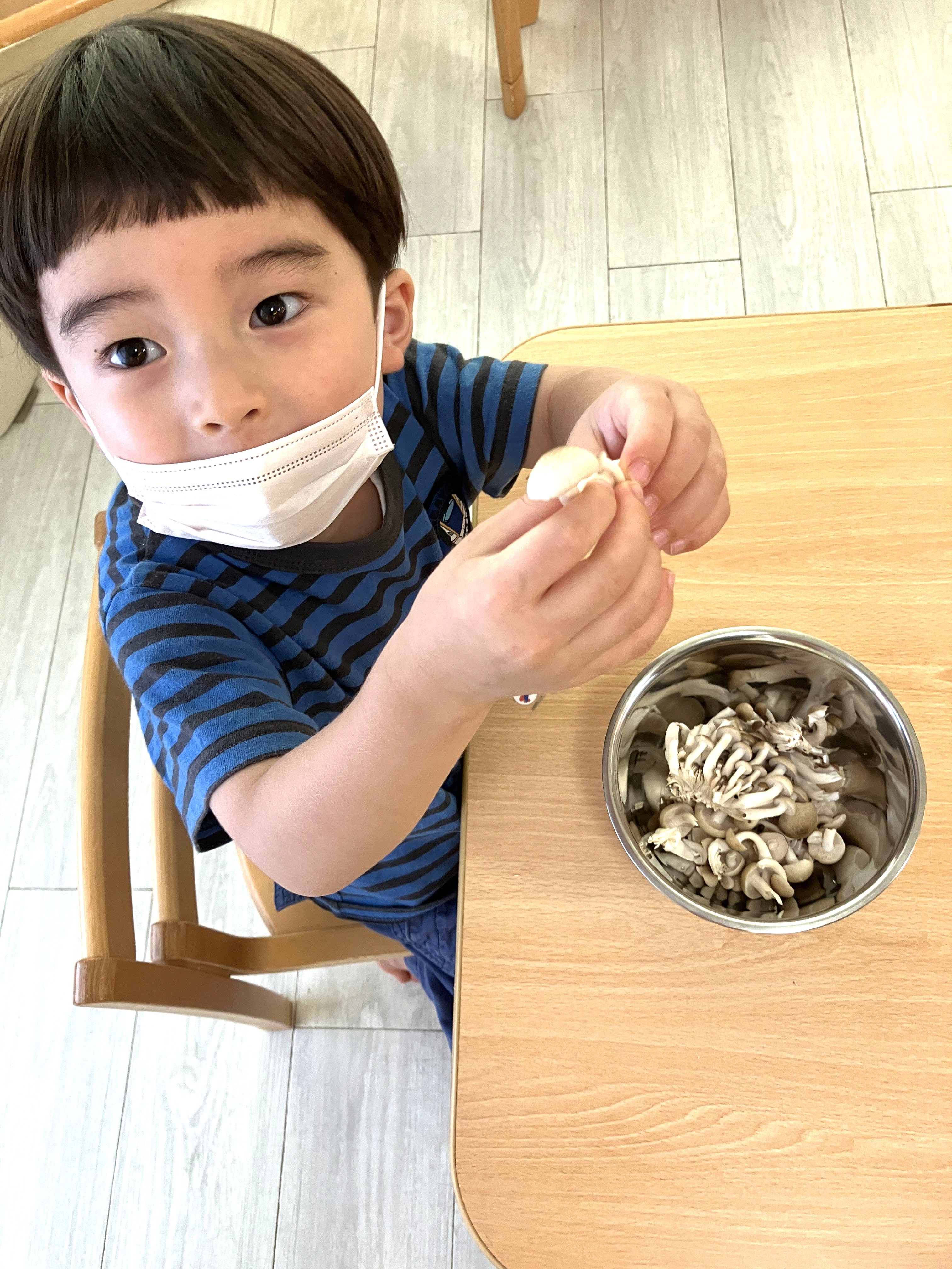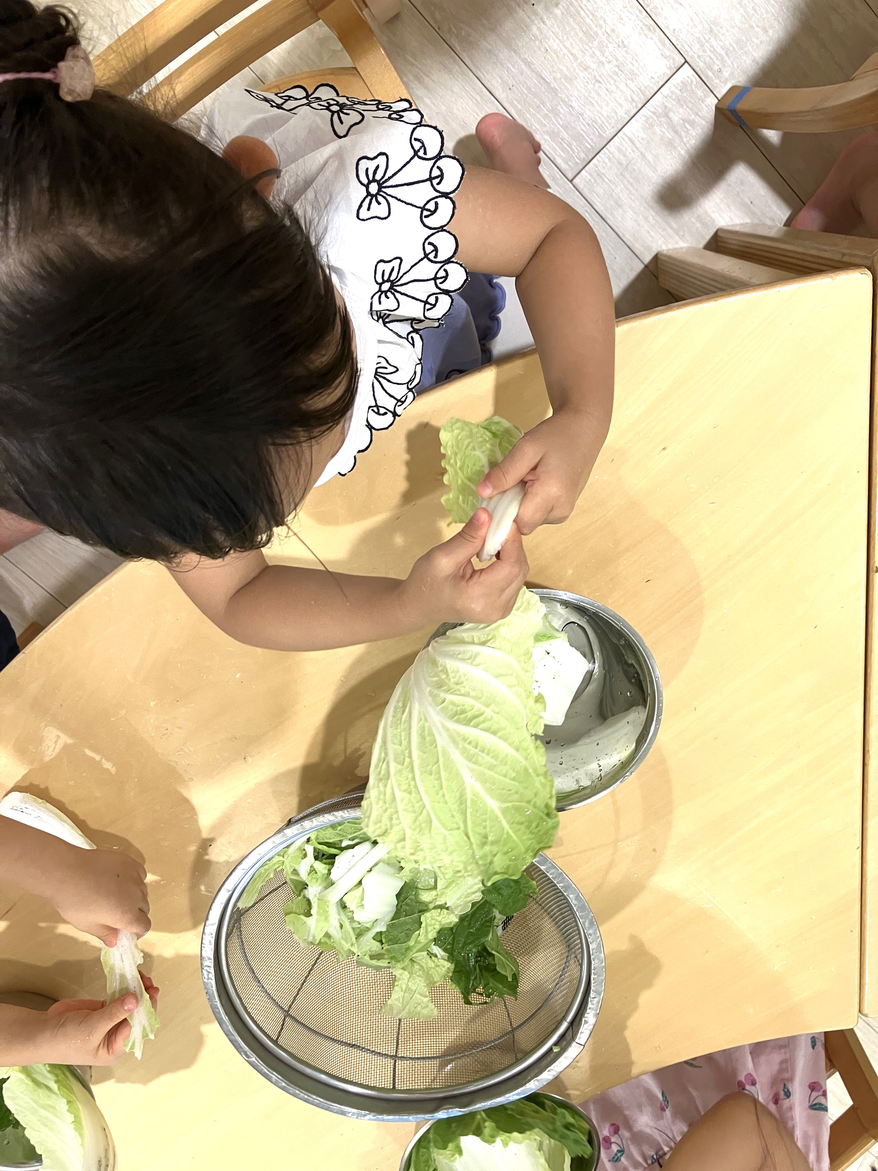 ランチルームでは、2歳児さんがきのこを割き割き、3歳児さんが白菜をチギチギと、かわいいお手伝いをしました。