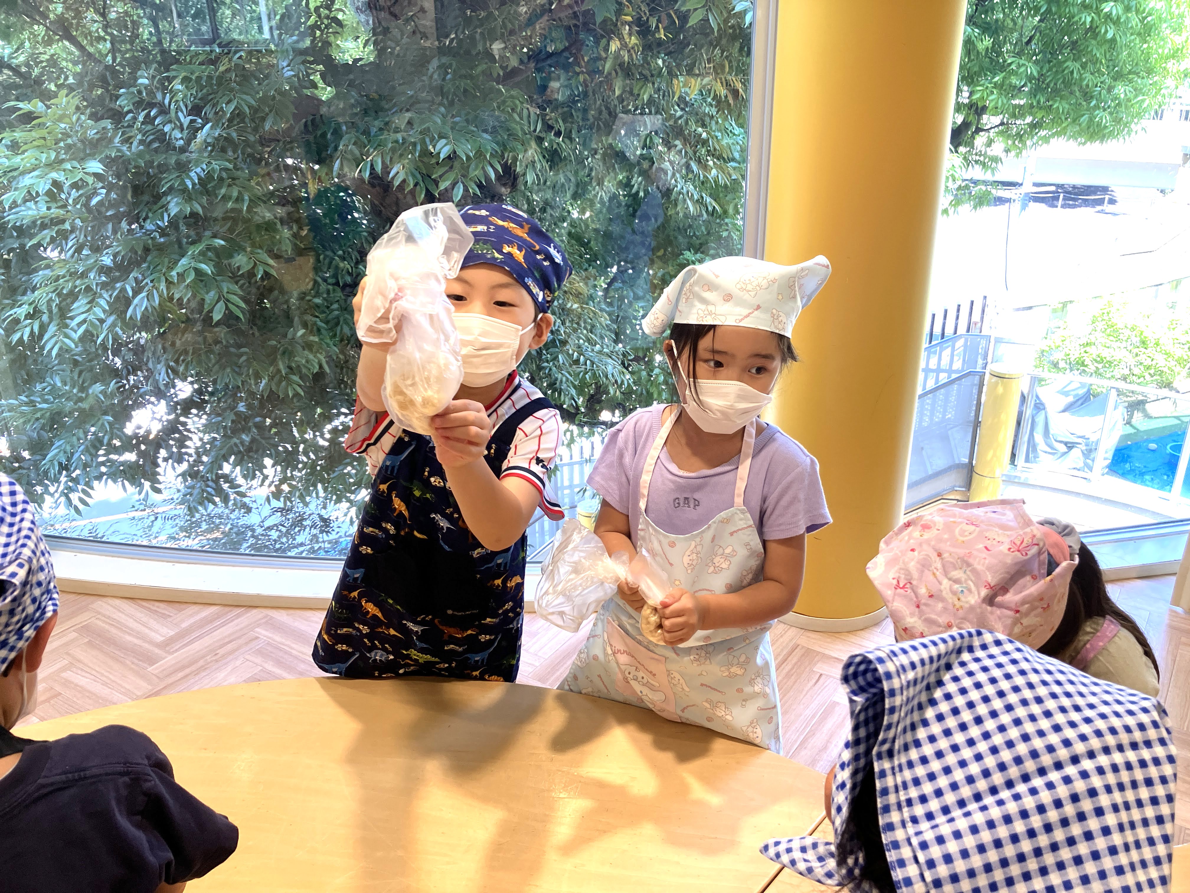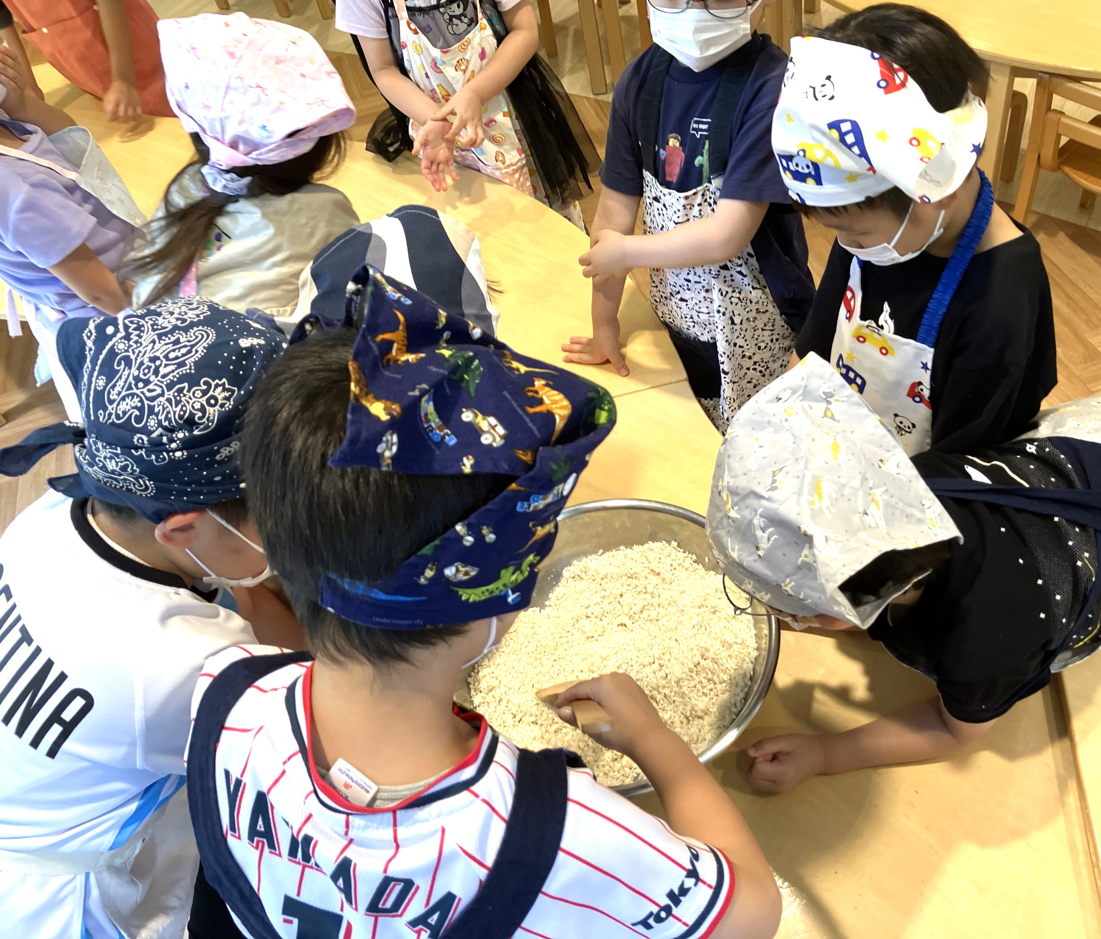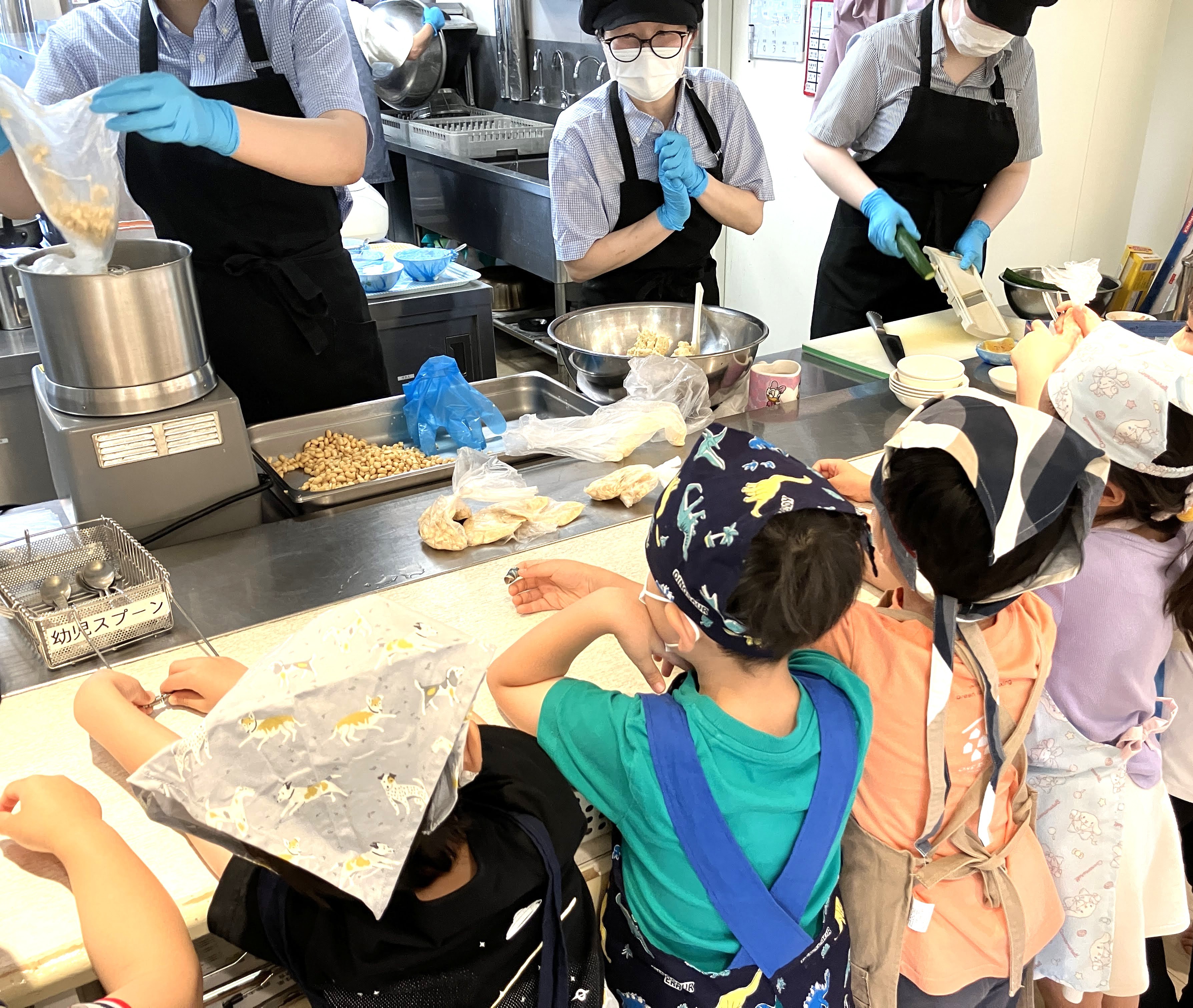 今日は、子どもたちが味噌作りに挑戦しました。大豆をつぶしたり、麹や菌を混ぜたりする工程を、子どもたちが楽しみながら行い、調理室の先生たちがそばでサポートしていました。
