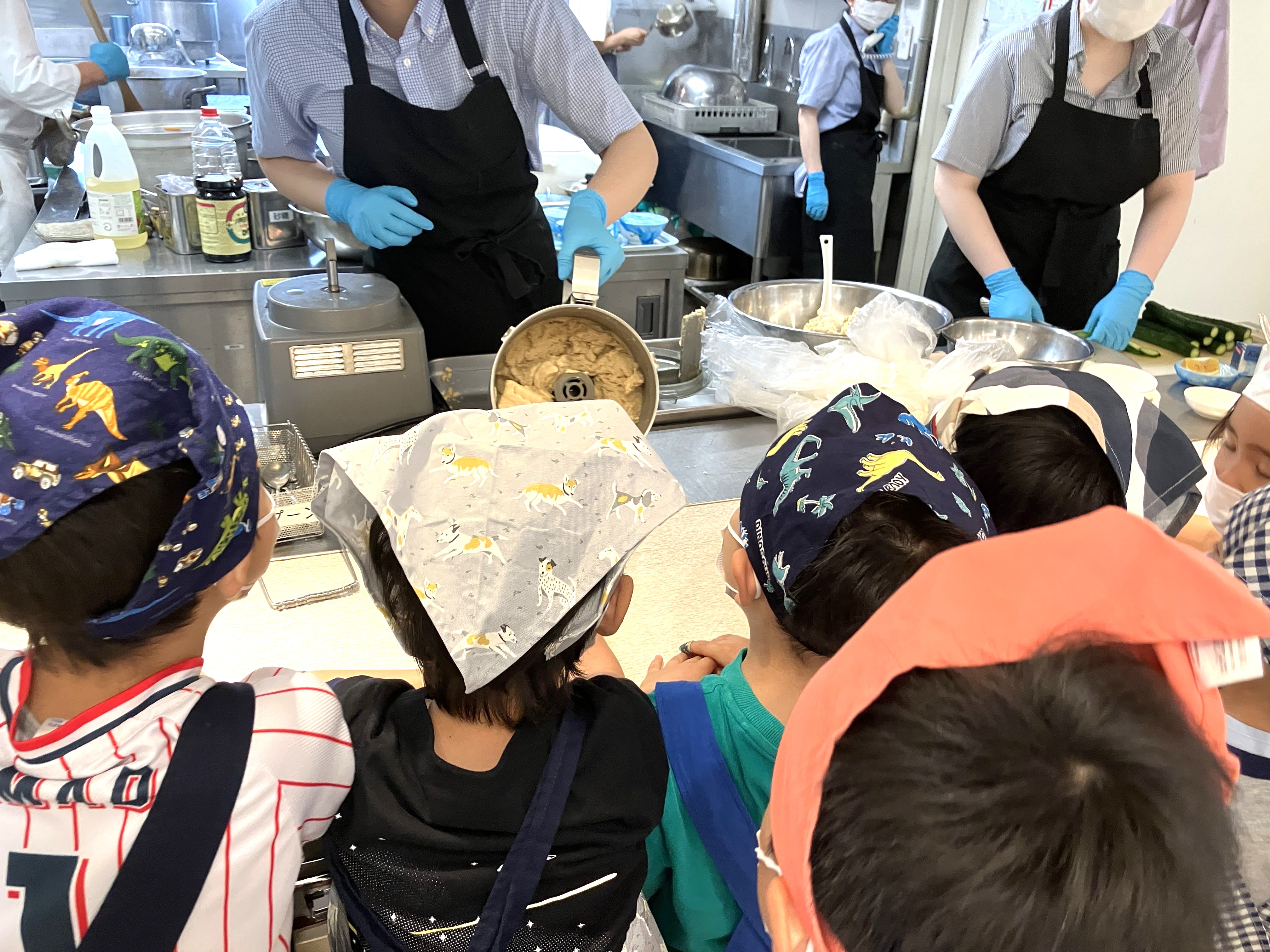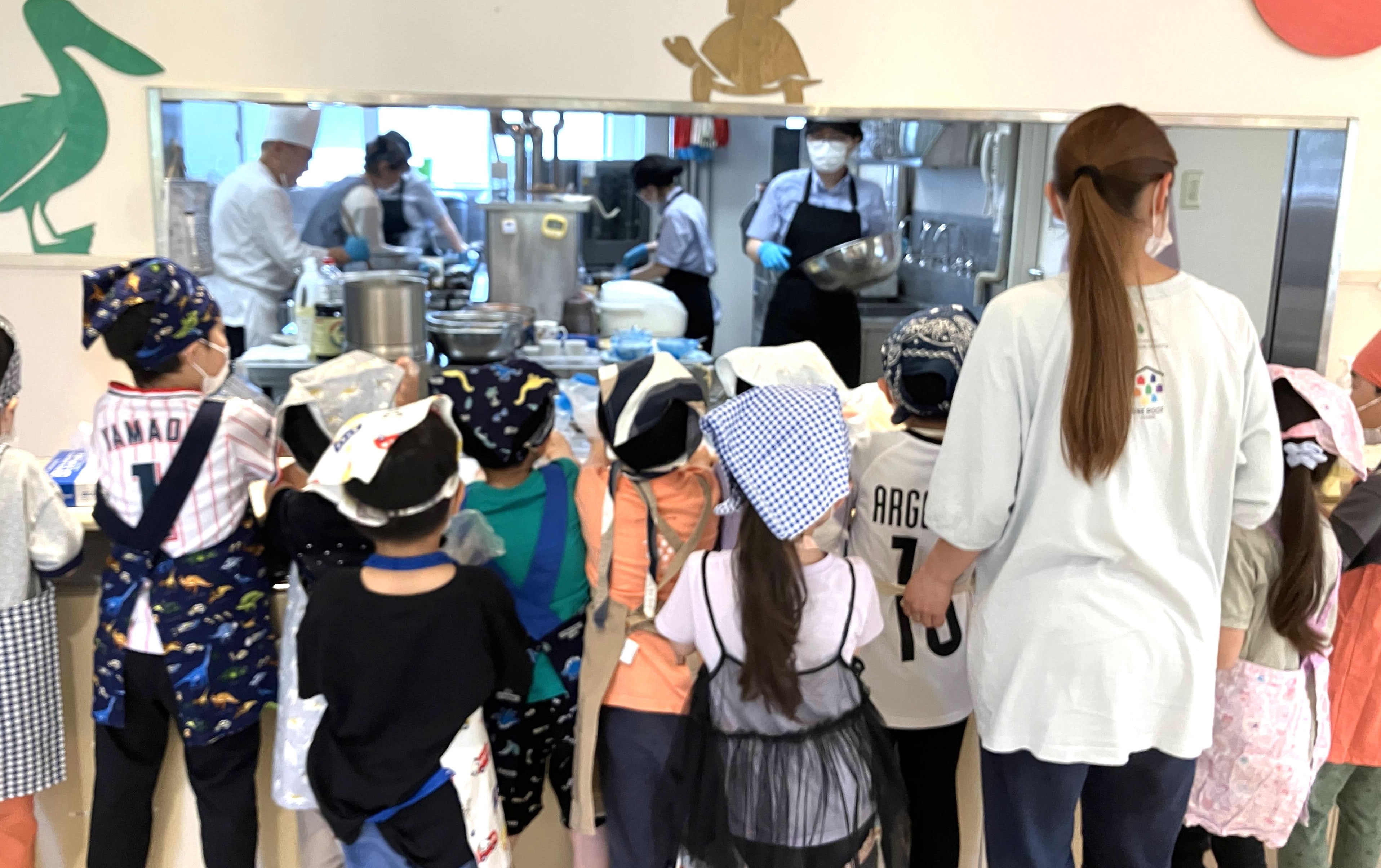 また、調理室では、子どもたちが先日園で収穫した夏野菜を、調理室の先生たちが切っている様子が見られました。調理室のカウンター越しに、子どもたちが背伸びをしてその様子をのぞき込む微笑ましい姿も見られました。