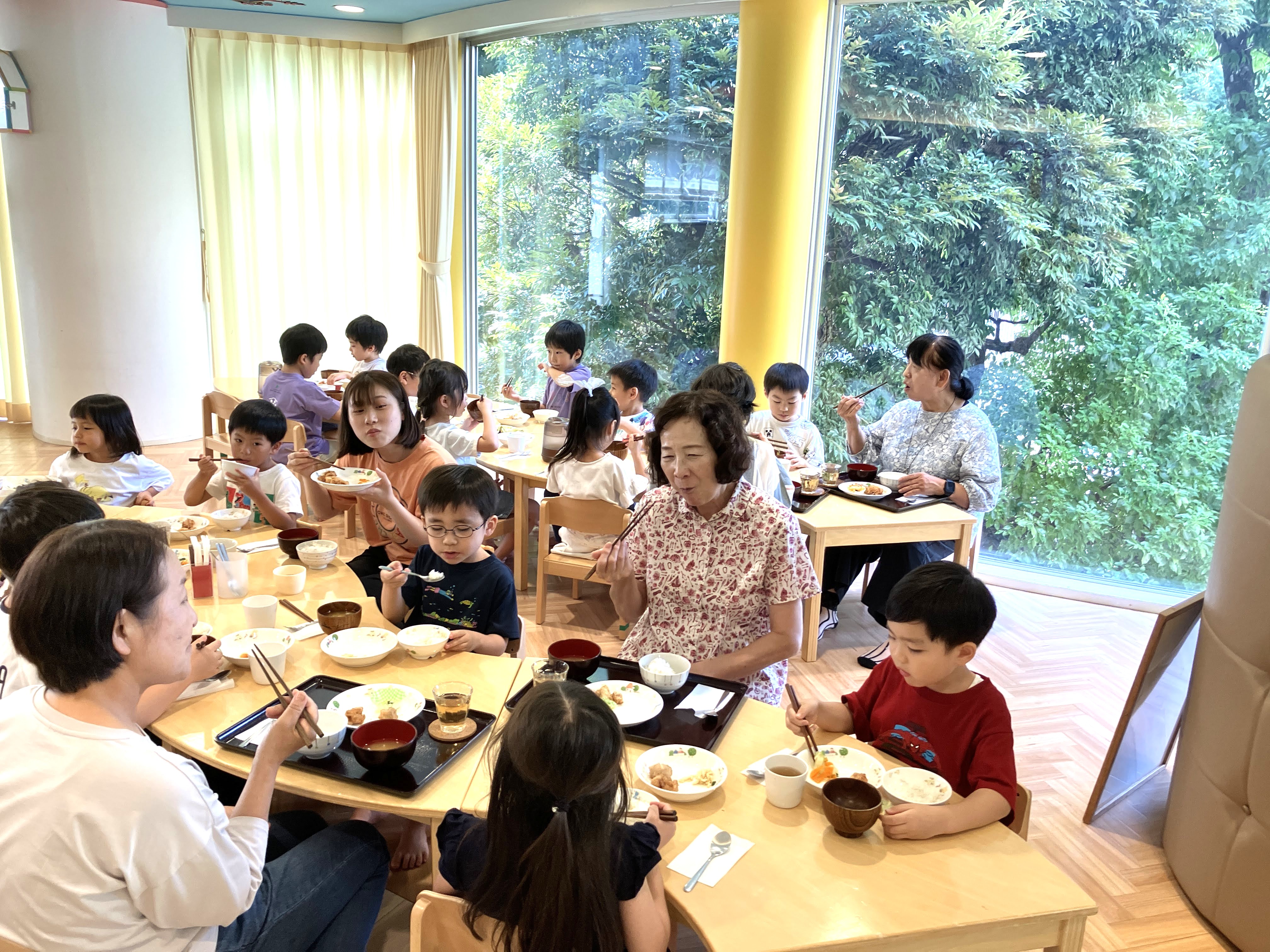 本日は、園児のおばあちゃん方をお招きし、子どもたちと一緒に遊んだり食事をしたりして、和やかな時間を過ごしました。