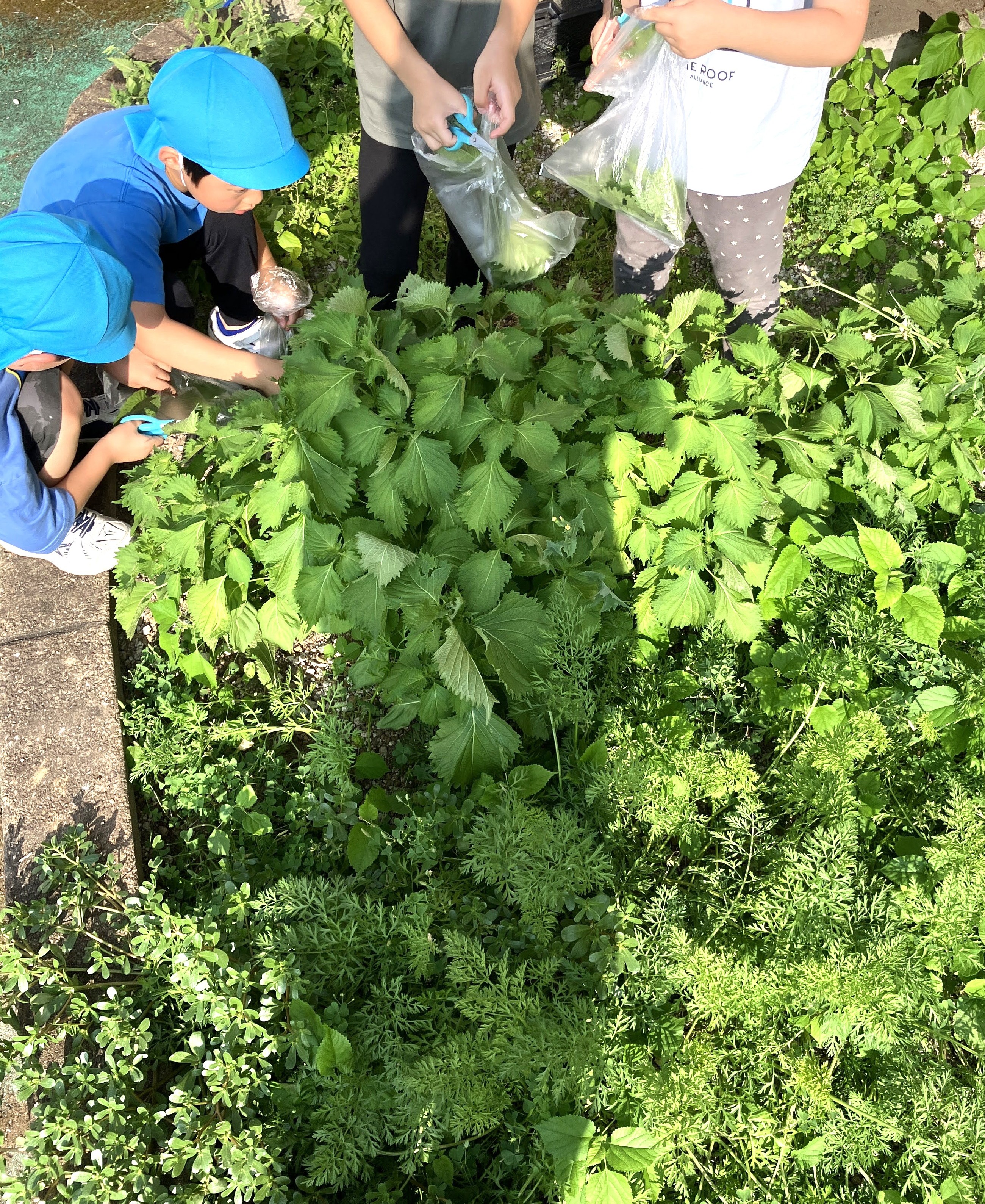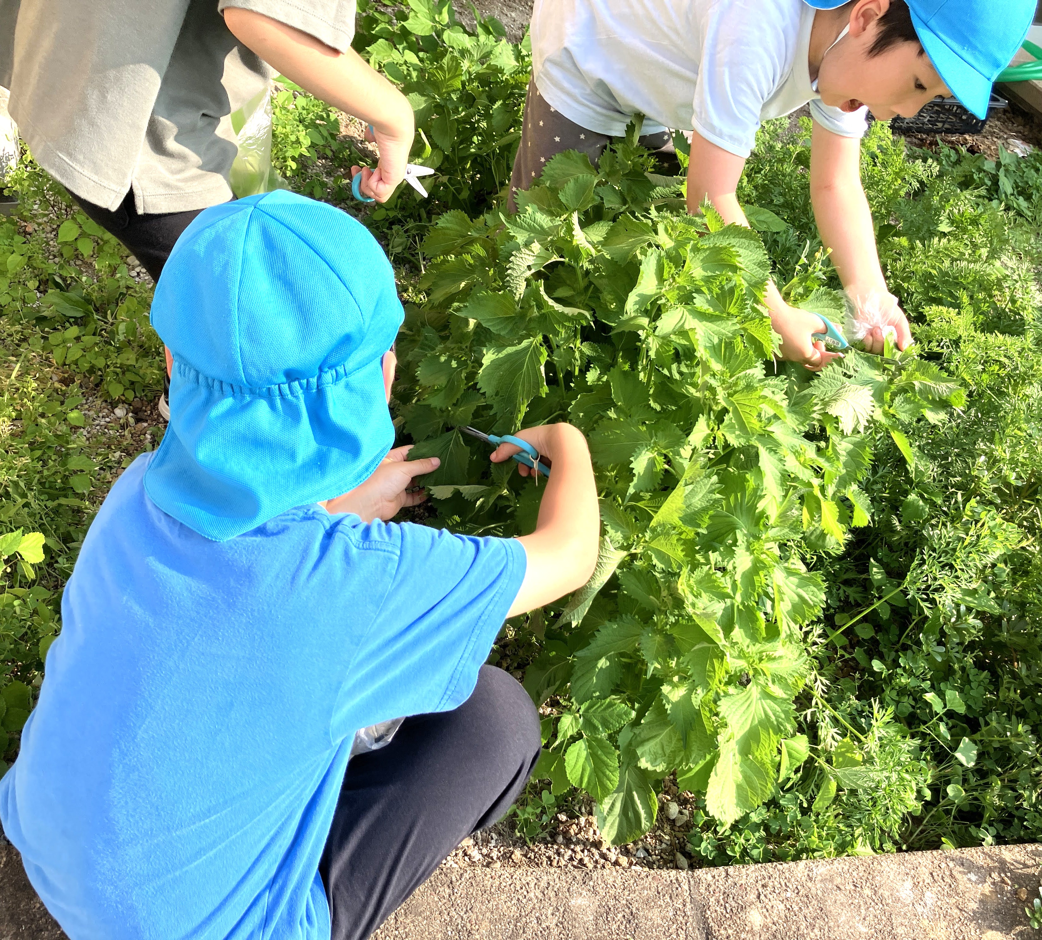 夏野菜ばかりに気をとられていると、隣の畑で、大葉としその葉がぐんぐん成長。今日は、ついに収穫の日!うれしそうに葉を摘む園児たちの手元が、誇らしげに見えました。