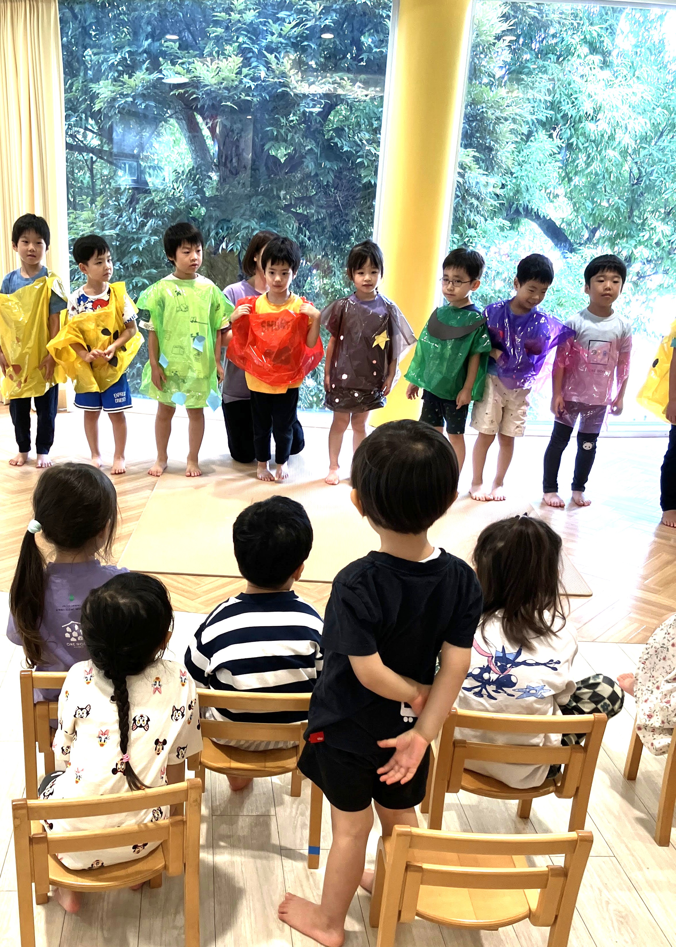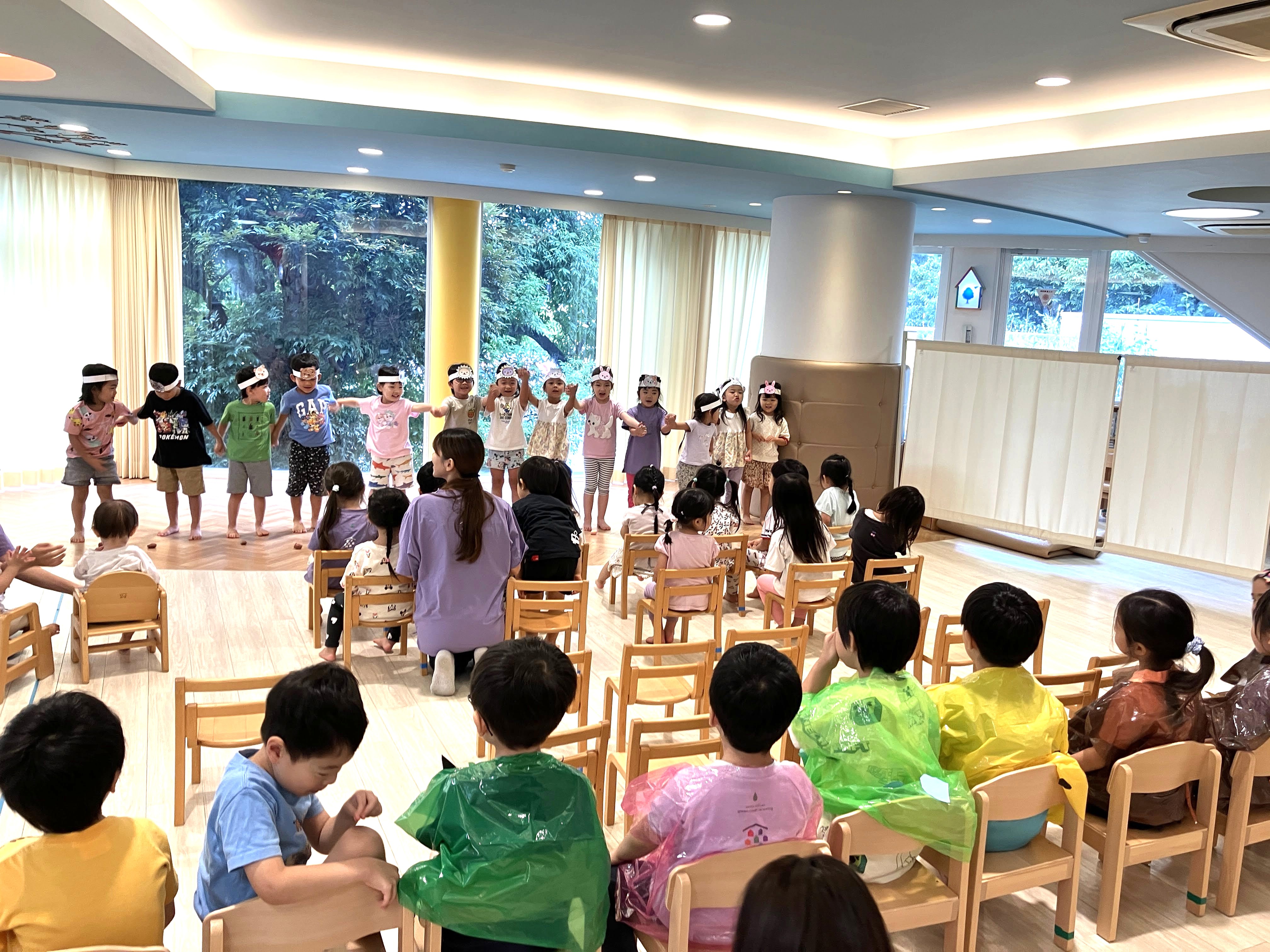 あっという間に4日目。3・4・5歳児クラスが集まり、お互いの劇を見せ合いました