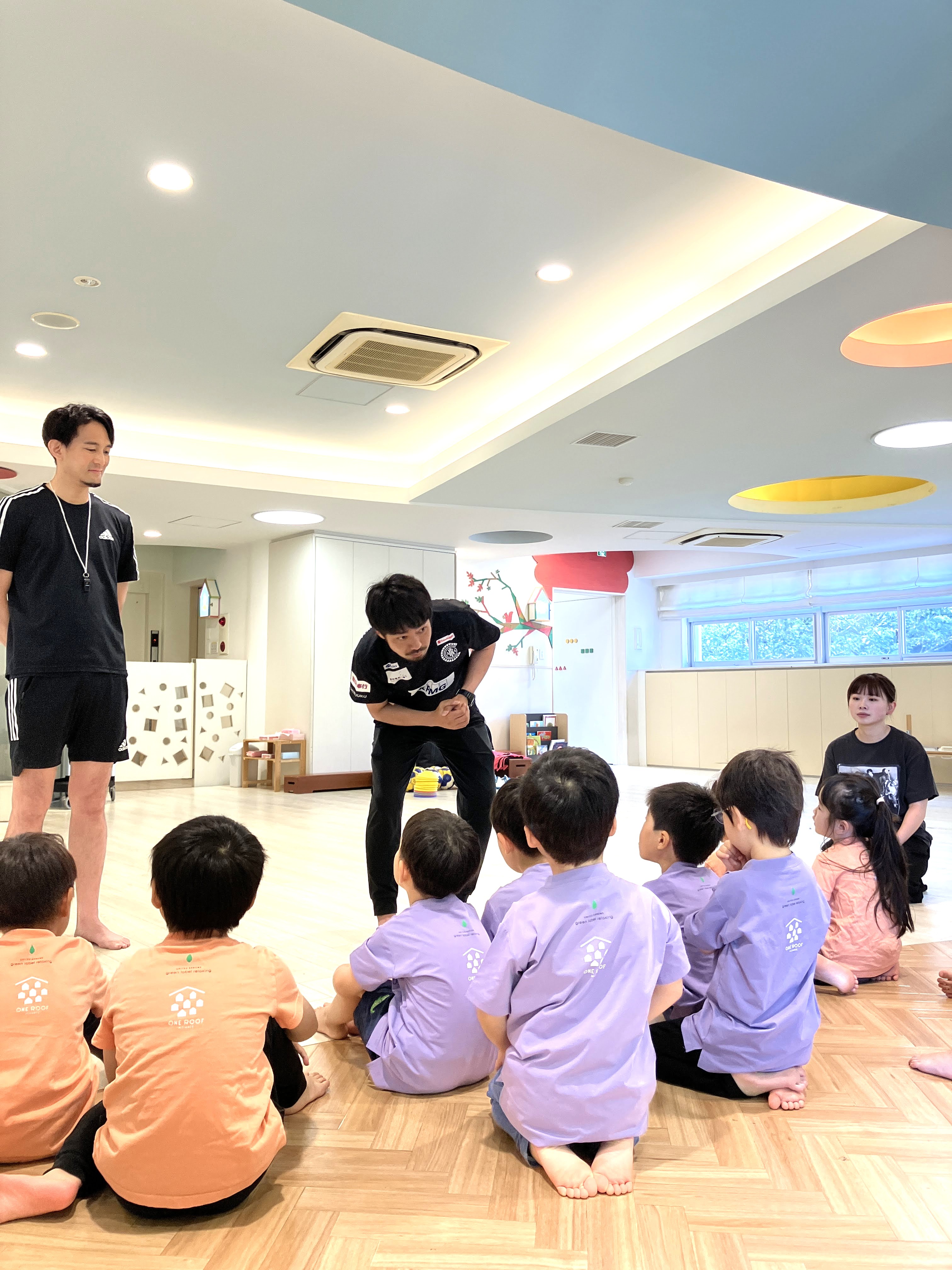 その日本代表を率いる須賀雄大監督が、本日はなんと保育園にお越しくださり、子どもたちの“監督”としてフットサルをご指導くださいました。子どもたちにはおなじみ、元サッカー選手の“大ちゃん“こと伊藤大介さんももちろん一緒にいらっしゃいました。