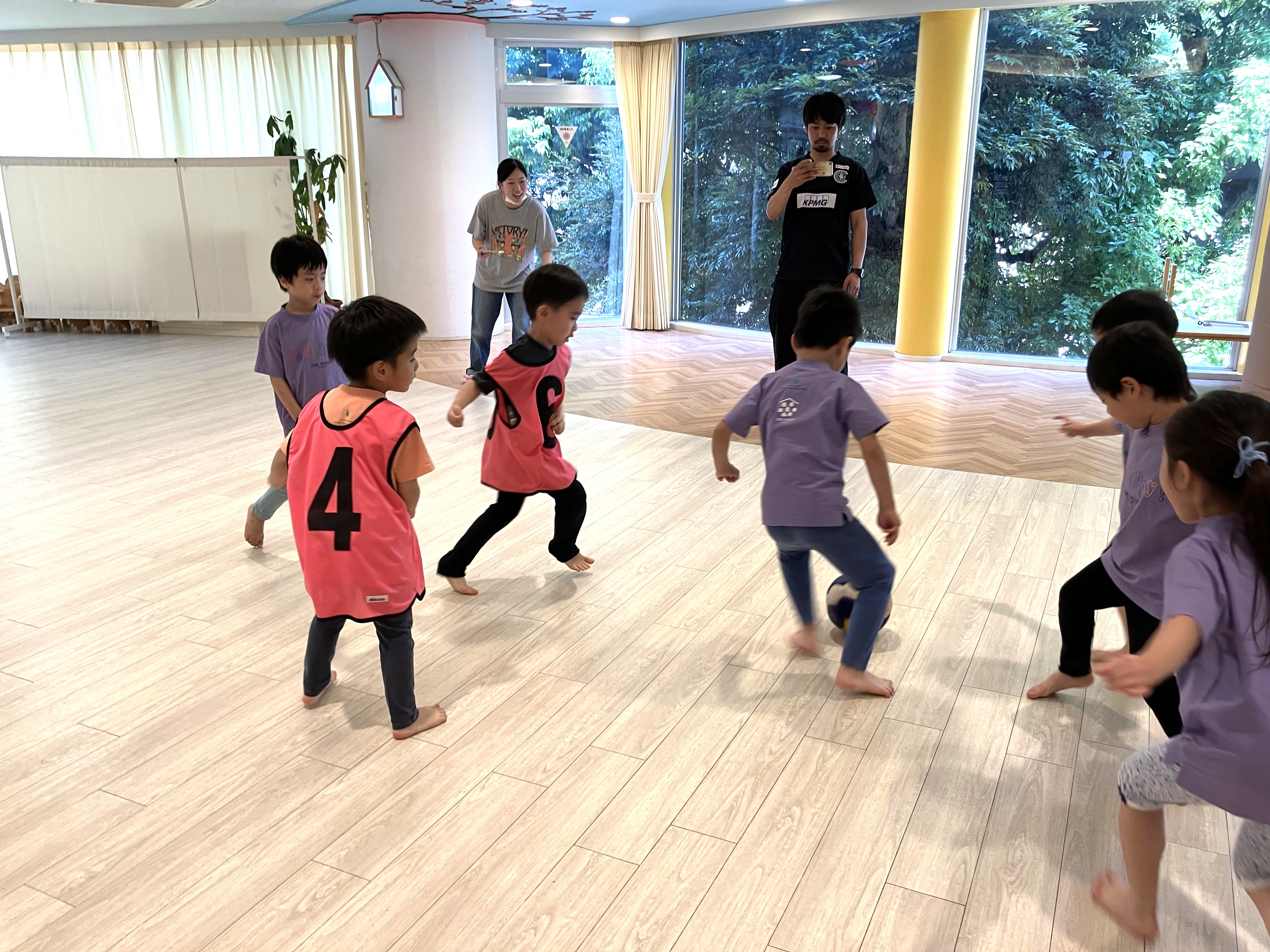 屋外で行うイメージの強いフットサルですが、監督によると「フットサルの“サル”は室内(サロン)を意味する言葉」なのだそうです。文字通り、園舎内は熱気あふれる白熱した時間となりました。