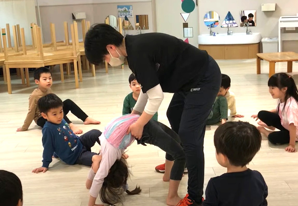 園では、外部から専門講師としてナオミ先生をお迎えし、定期的に楽しい運動プログラムを行っています。