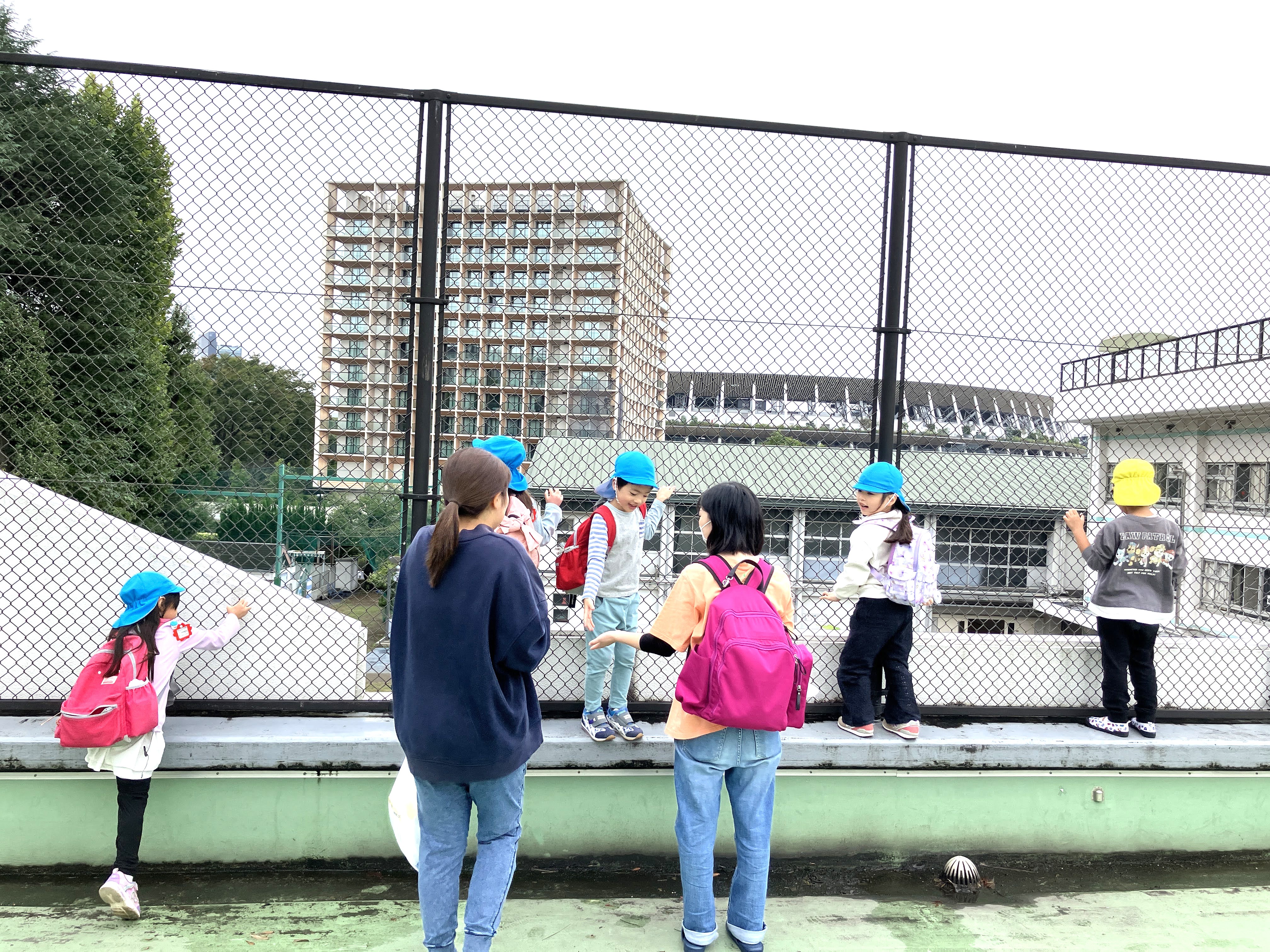 校舎内では、見たことのない道具や楽器を前に「これなあに?」と目を輝かせる子どもたち。お姉ちゃんやお兄ちゃんの席に座らせてもらい、小学生になった気分を味わう姿もありました。屋上にも案内してもらい、そこから見えたのはいつも過ごしている保育園。「あっ!ぼくたちの保育園だ!」と嬉しそうに指をさす子もいました。