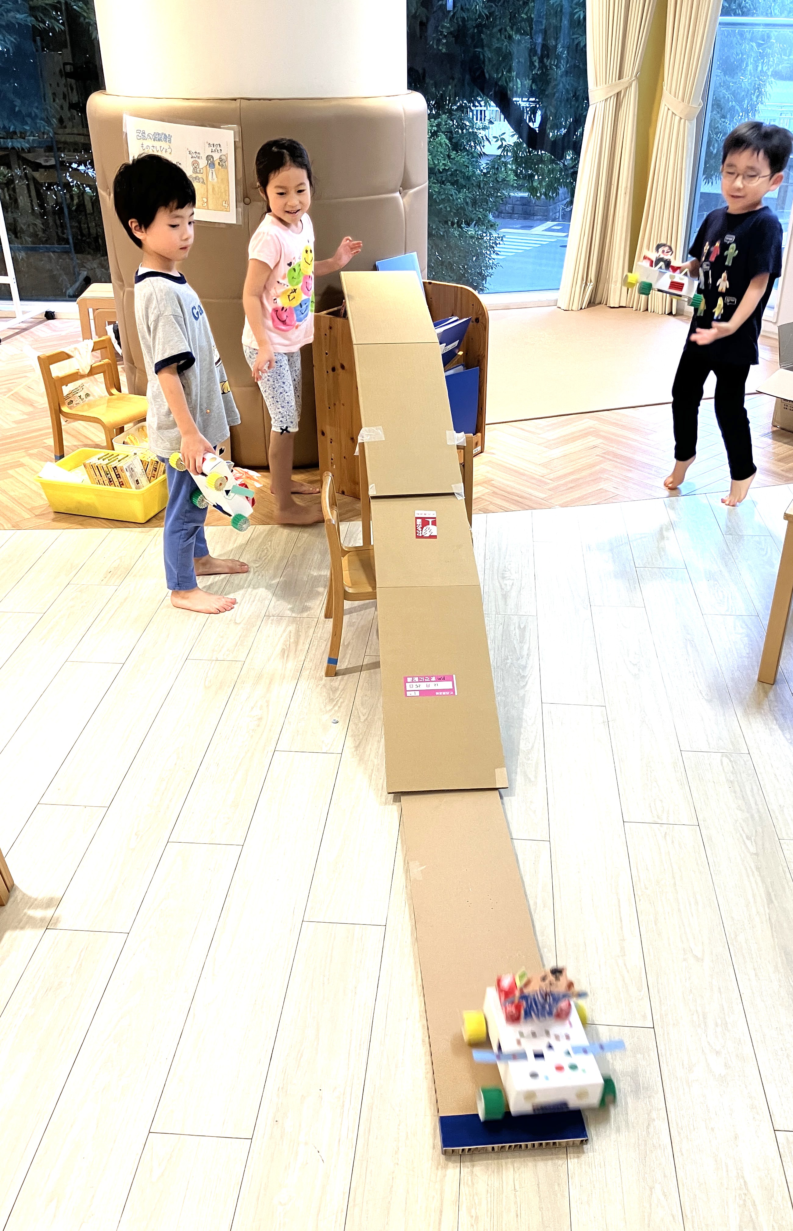 完成した車を手にした子どもたちは、さらに段ボールでサーキット場を作り上げ、高い坂道から一斉にレース!
