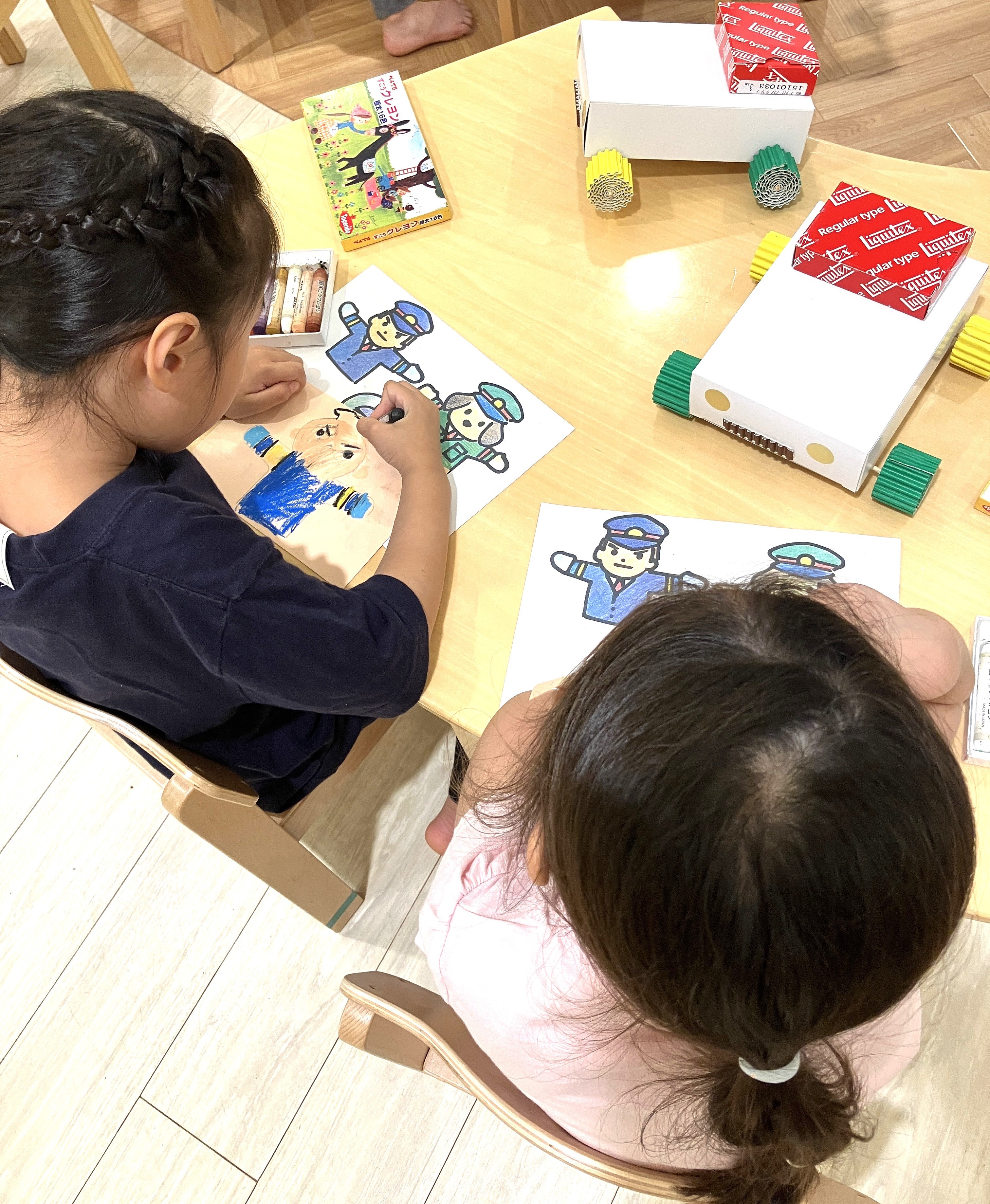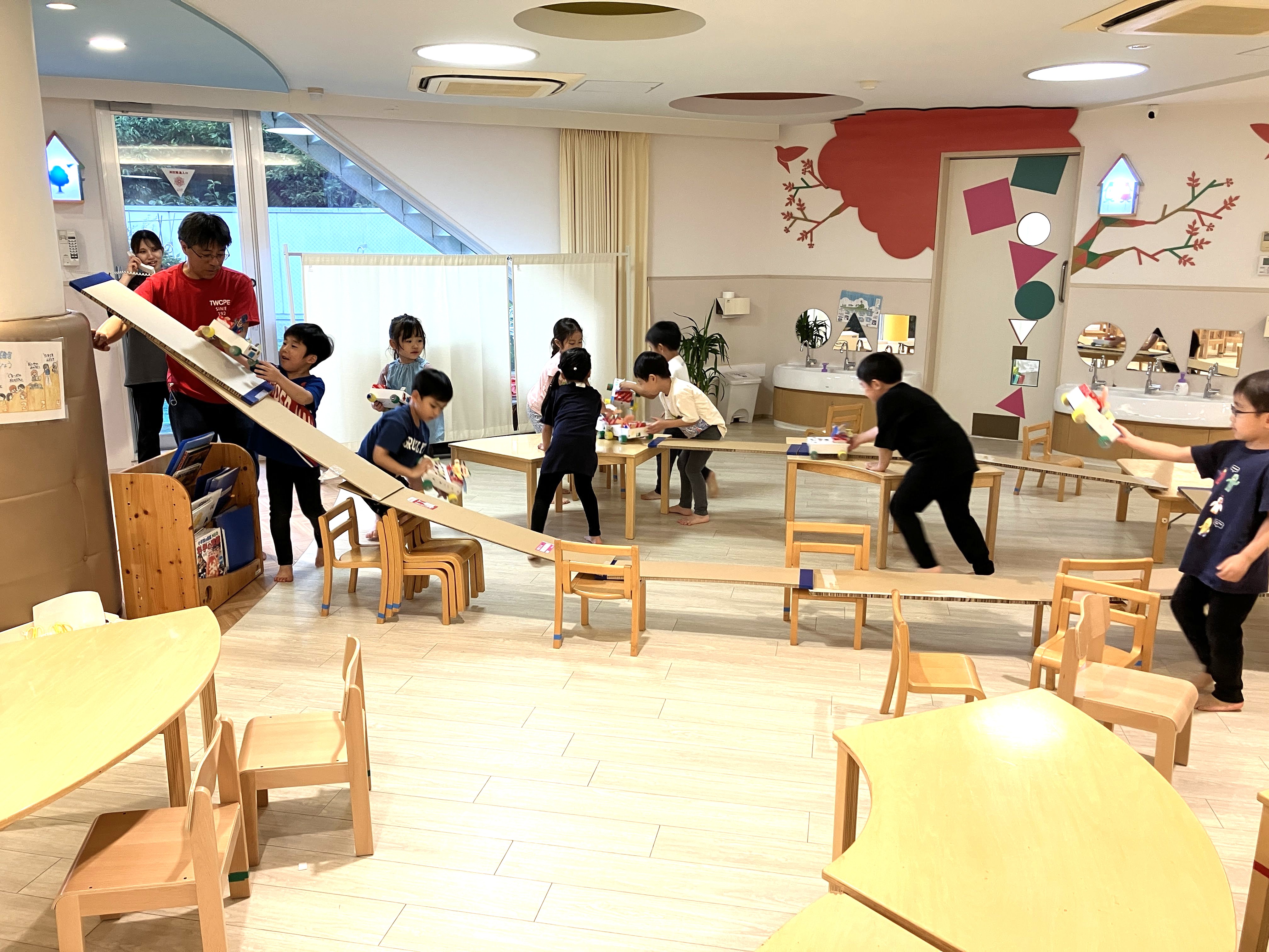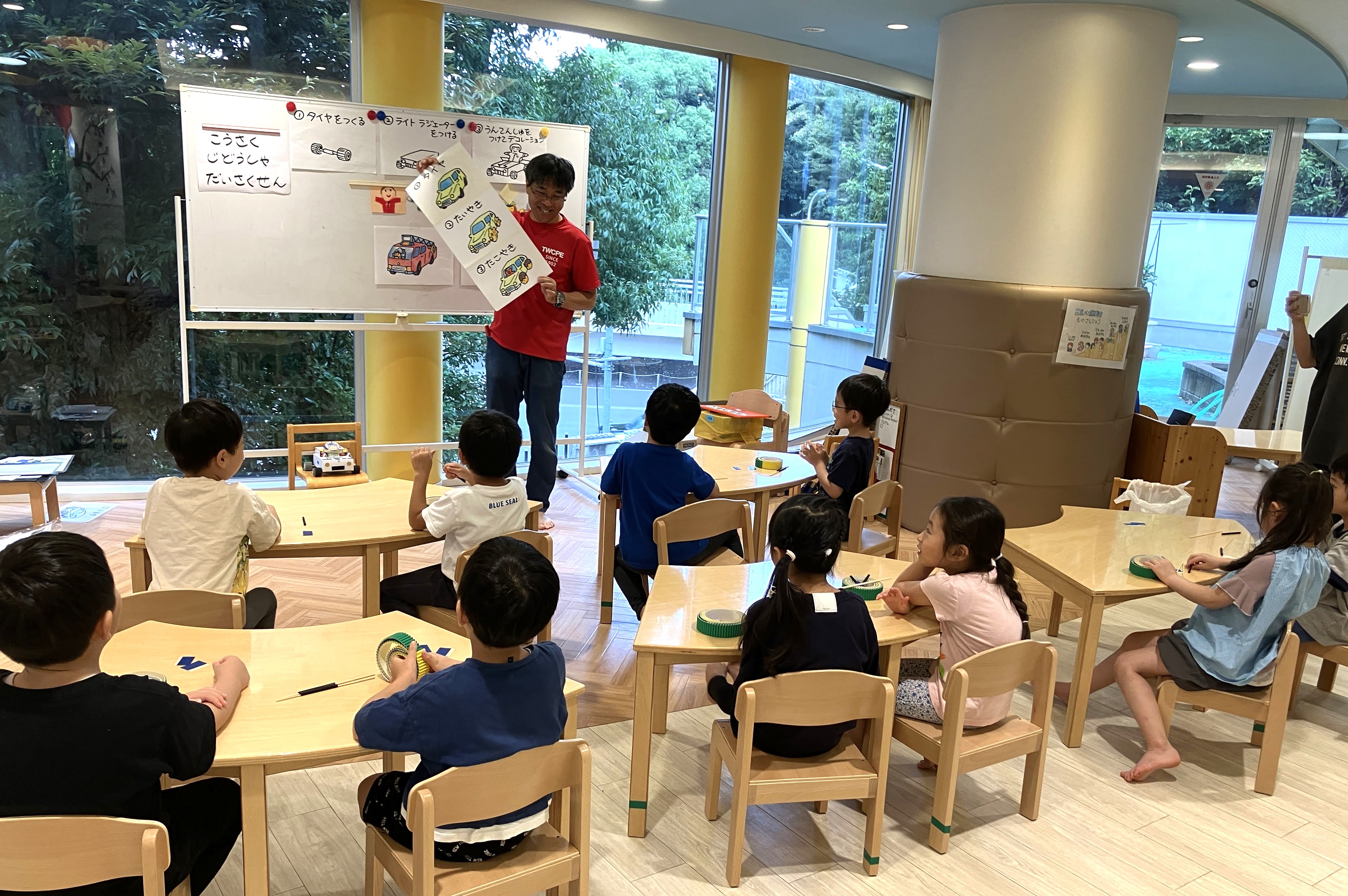 午前中は屋上でのびのびプール遊びを楽しんだ5歳児クラス。午後は手作りの自動車づくりに挑戦しました!