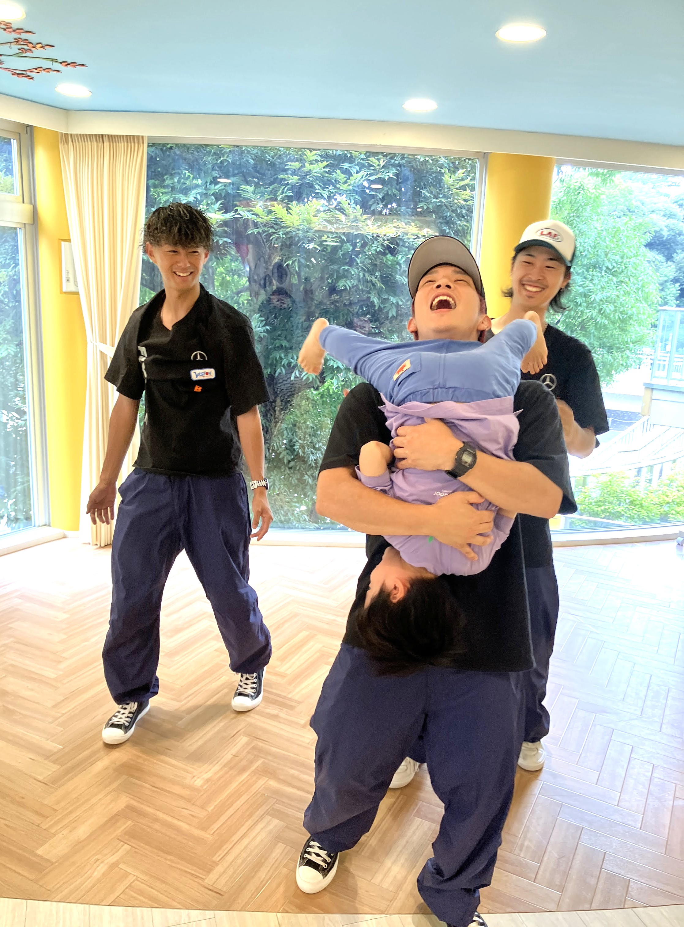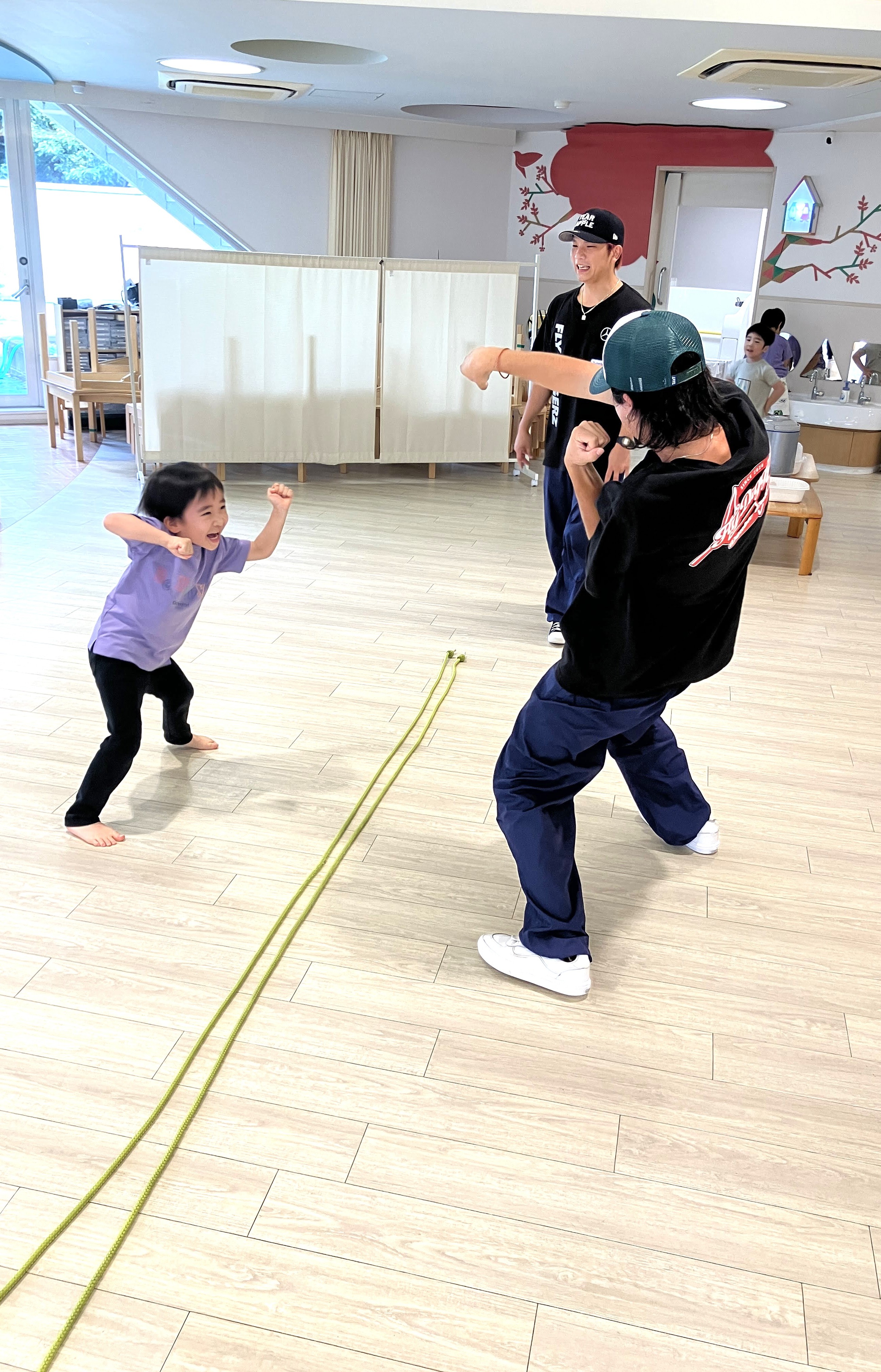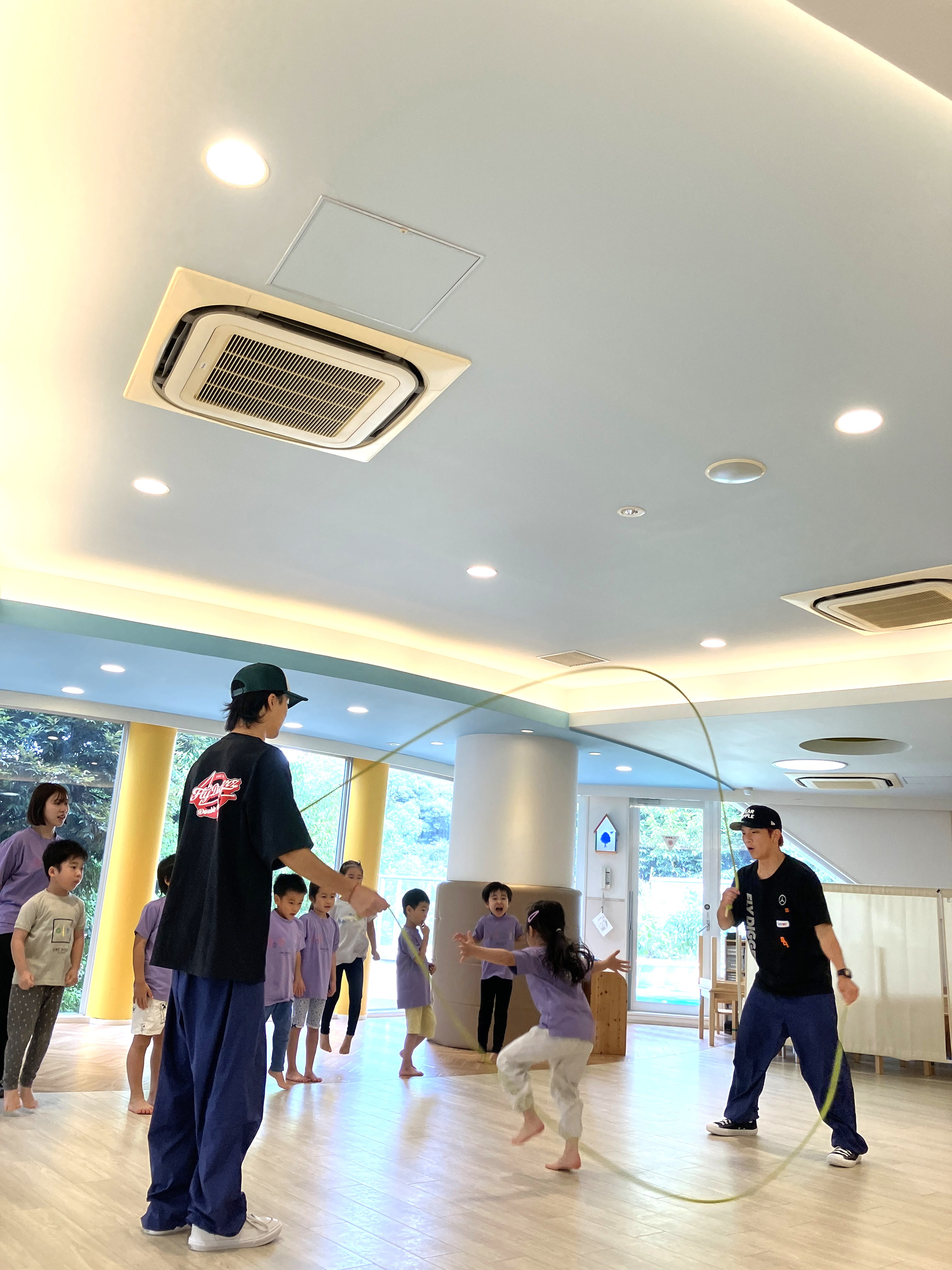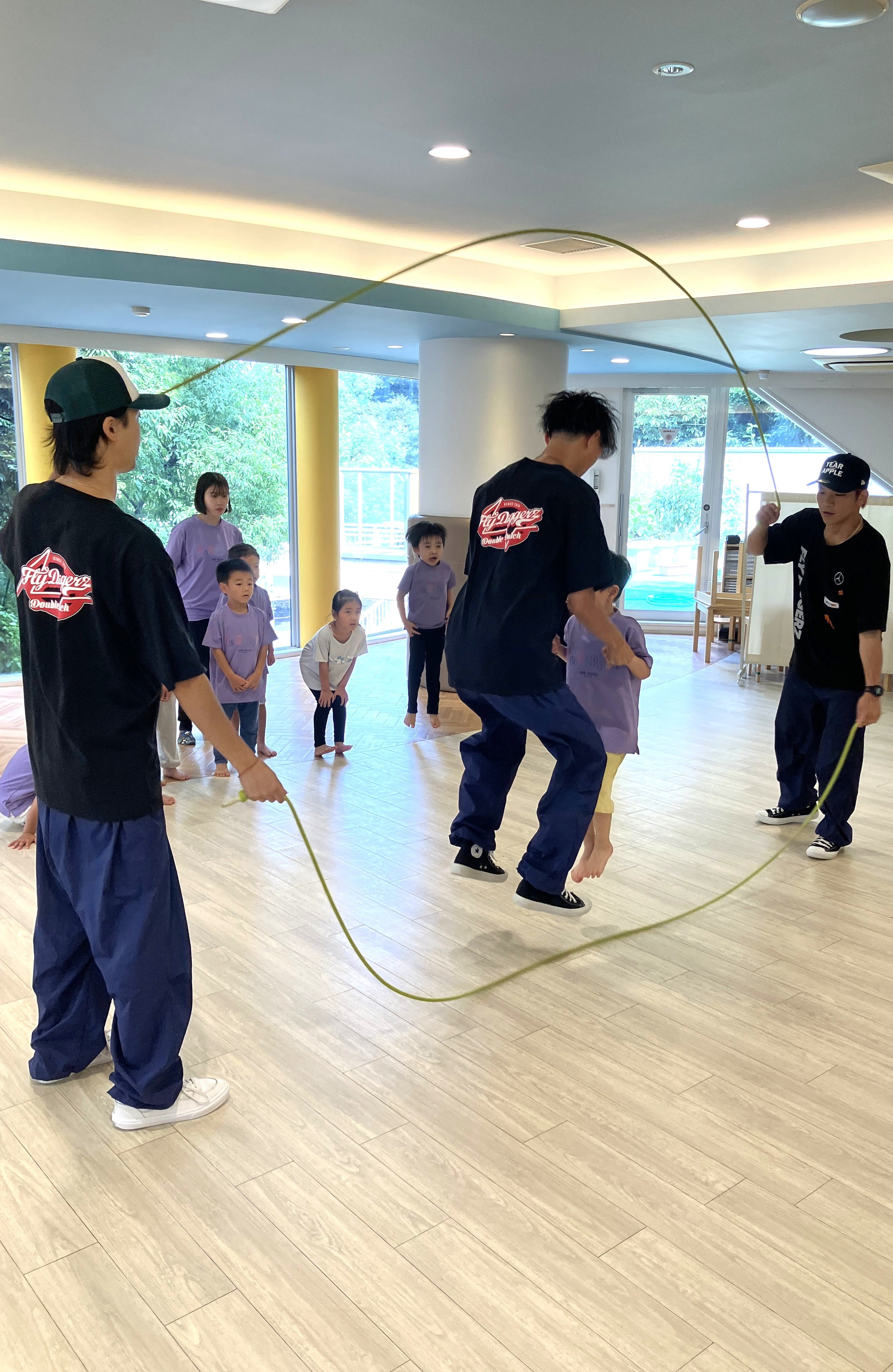 今日は、世界大会2連覇の実績を持つプロダブルダッチチームFLY DIGGERZ(フライ ディガーズ)さんがご来園。ダブルダッチは、回る2本のロープの中で跳びながら様々なパフォーマンスを披露するスポーツ。さすが、ロープを回すのも、場を回すのも世界一。軽快なリズムに合わせ、子どもたちはみんな上手に跳べるようになります。