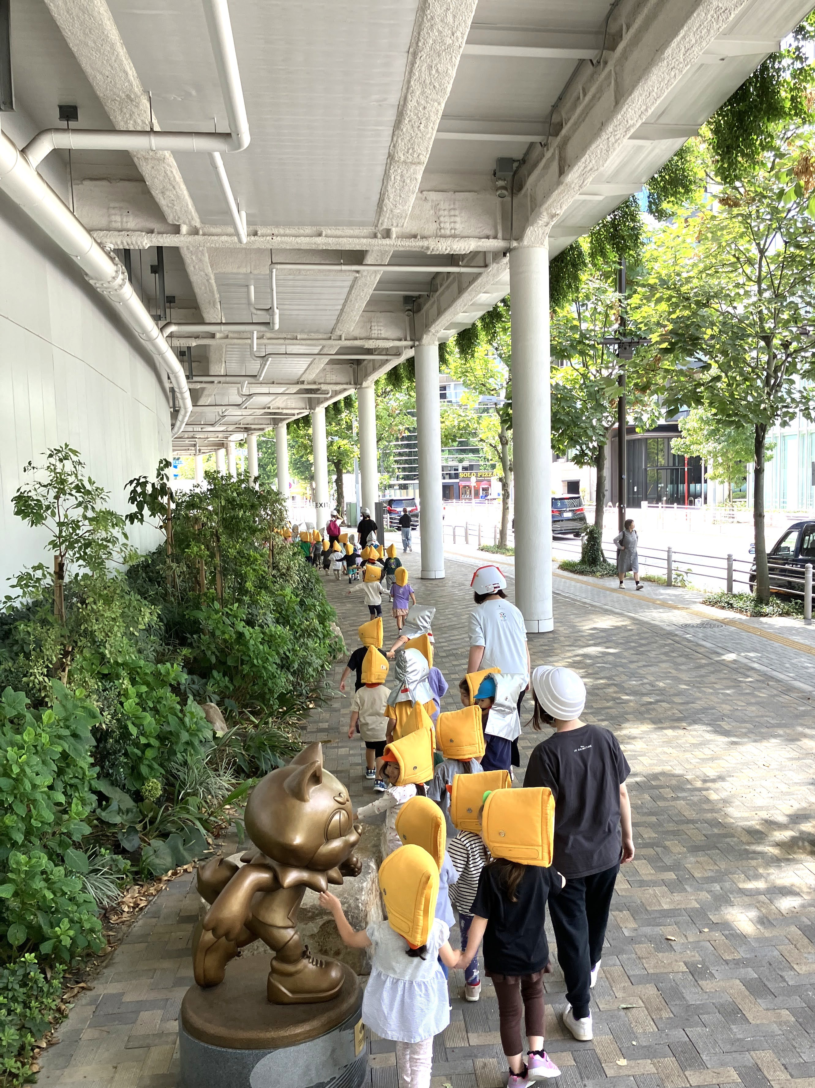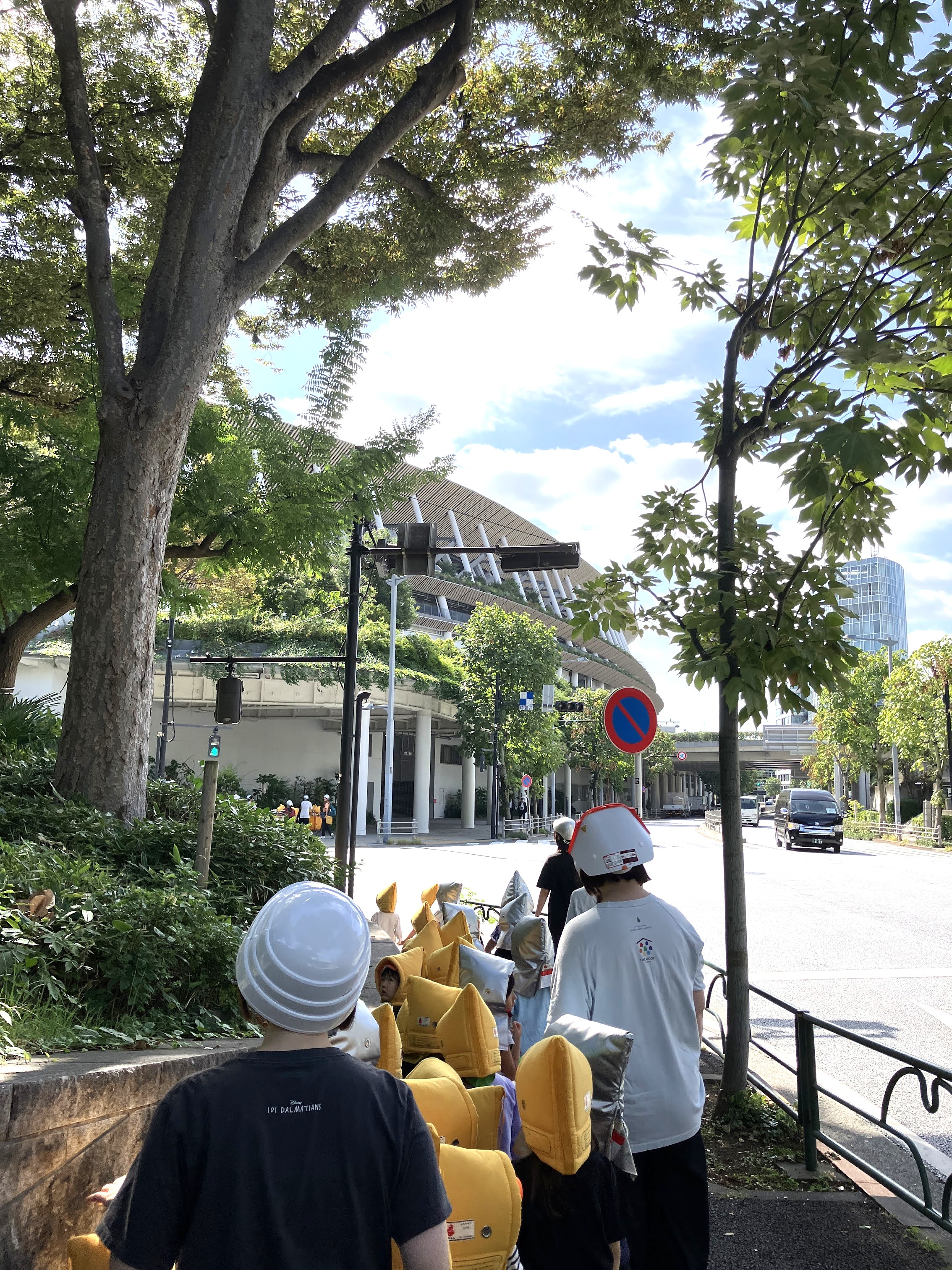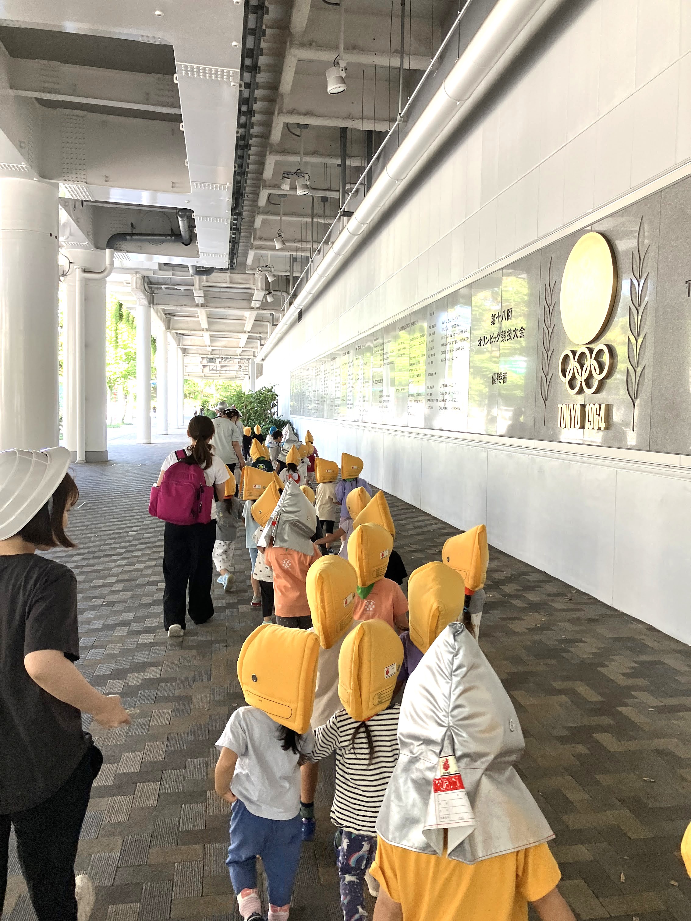 近くの国立競技場方面へ向かういつものさんぽ道を、今日は防災頭巾をかぶって歩きます。