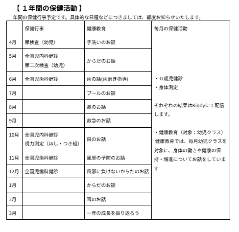 ご入園、ご進級おめでとうございます。保健だよりでは、保健行事のお知らせやお子さまの健康に関することなどをお知らせしていきます。