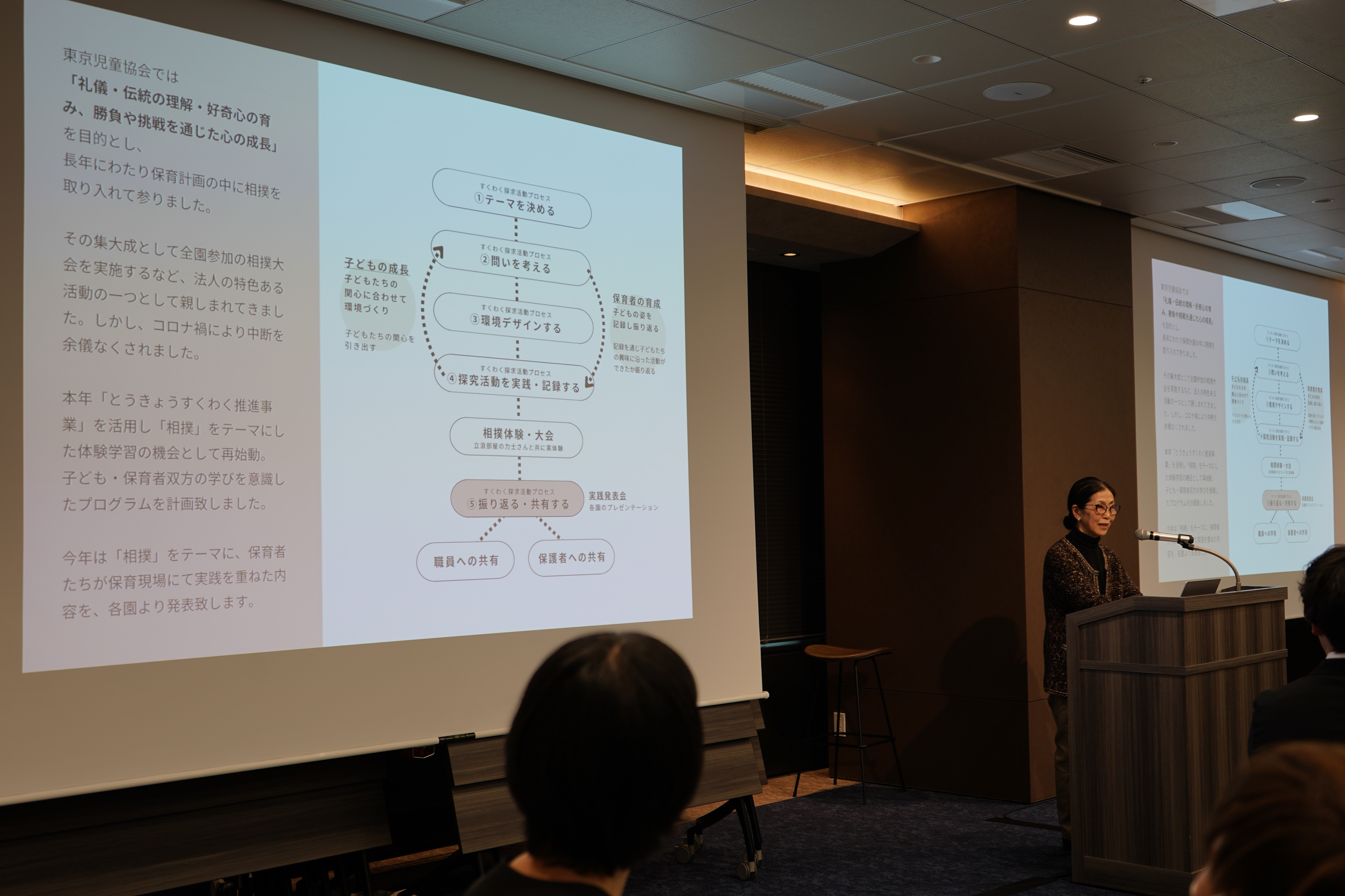 東京児童協会では保育の質に注目し、職員の専門性向上に努めており、この実践発表の場は「振り返りを起点とした学びの場」として位置付けています。